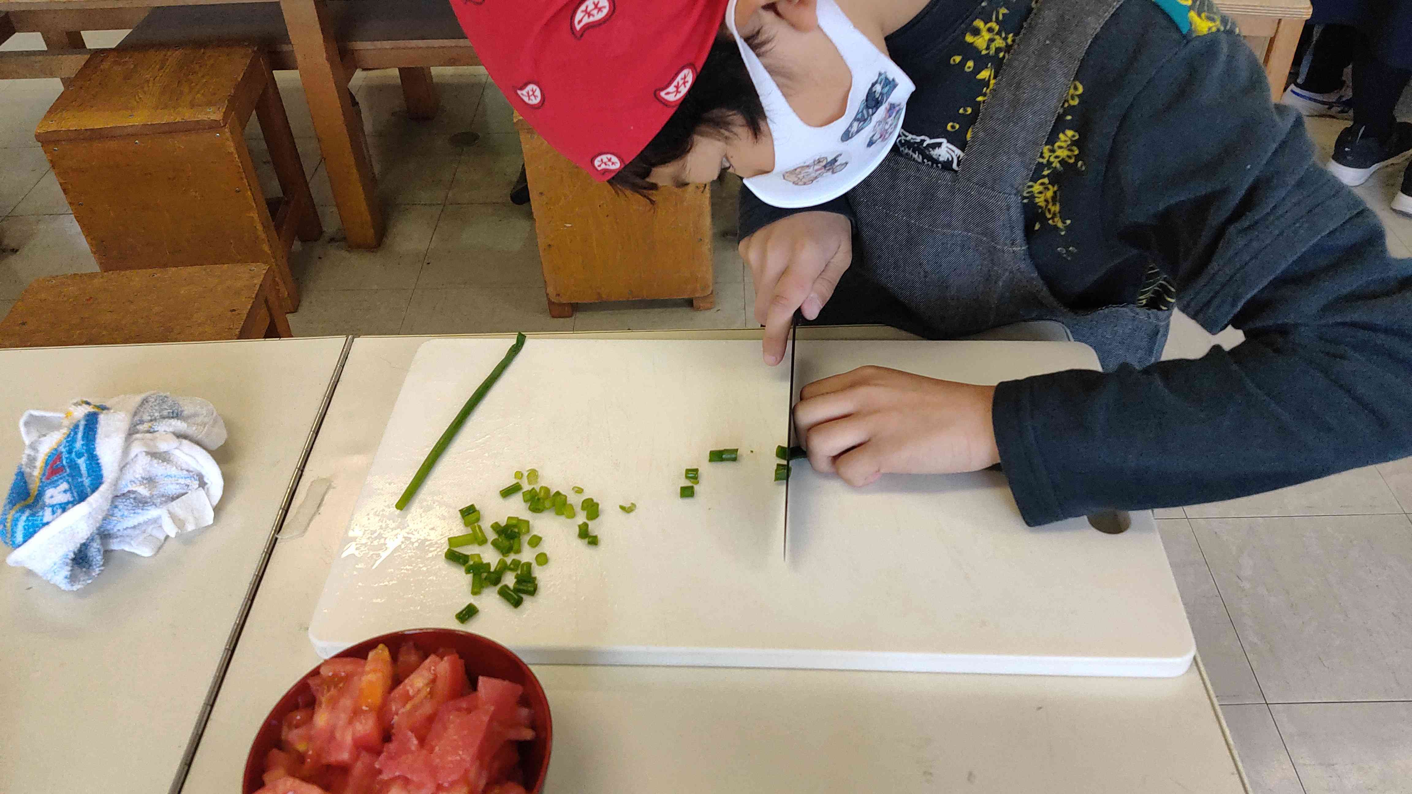だごじるです。 トマトがたっぷり。 手つきもよく、家でのお手伝いの成果ですね。