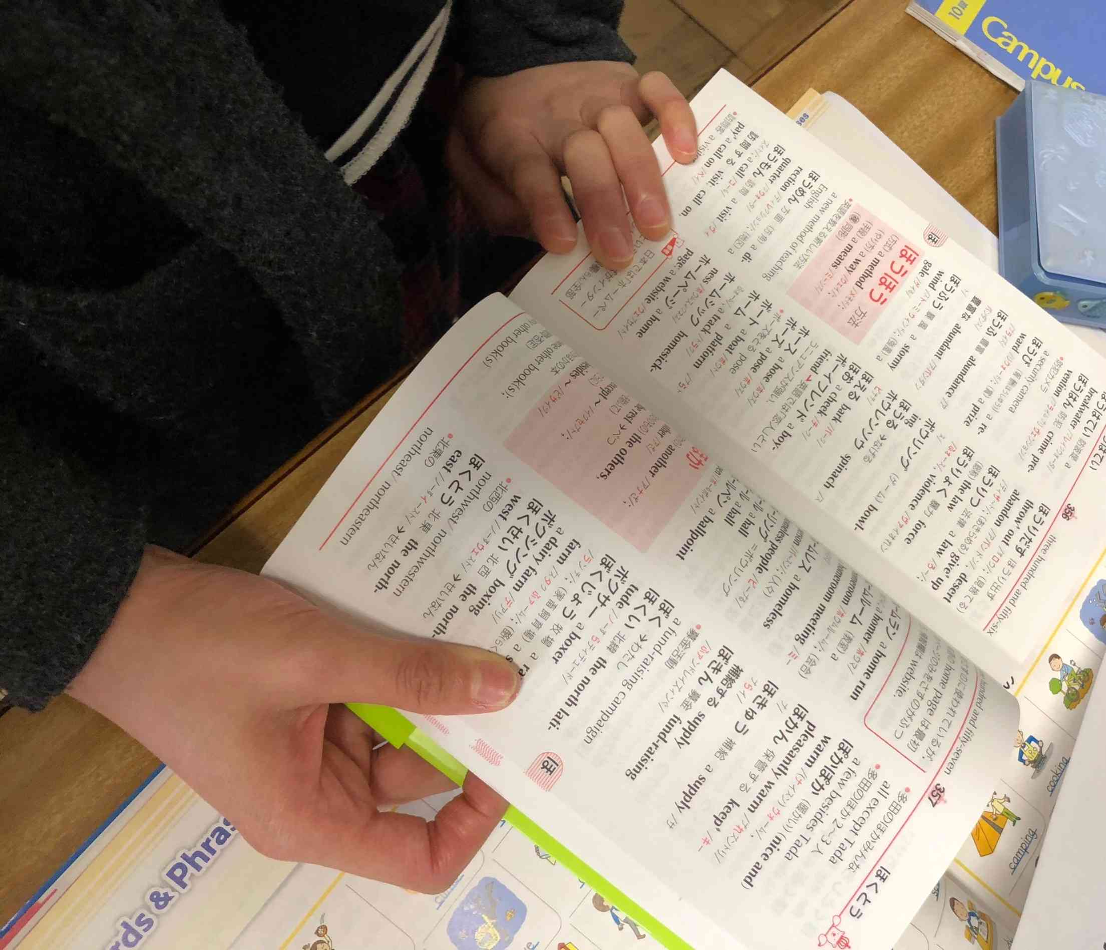スピーチの内容を考える時、分からない単語を辞書で調べるように声をかけています 英語が楽しい 1年前 3割 現在 9割!!! 専科の教員の努力の成果です。 引き続き応援してあげてください。