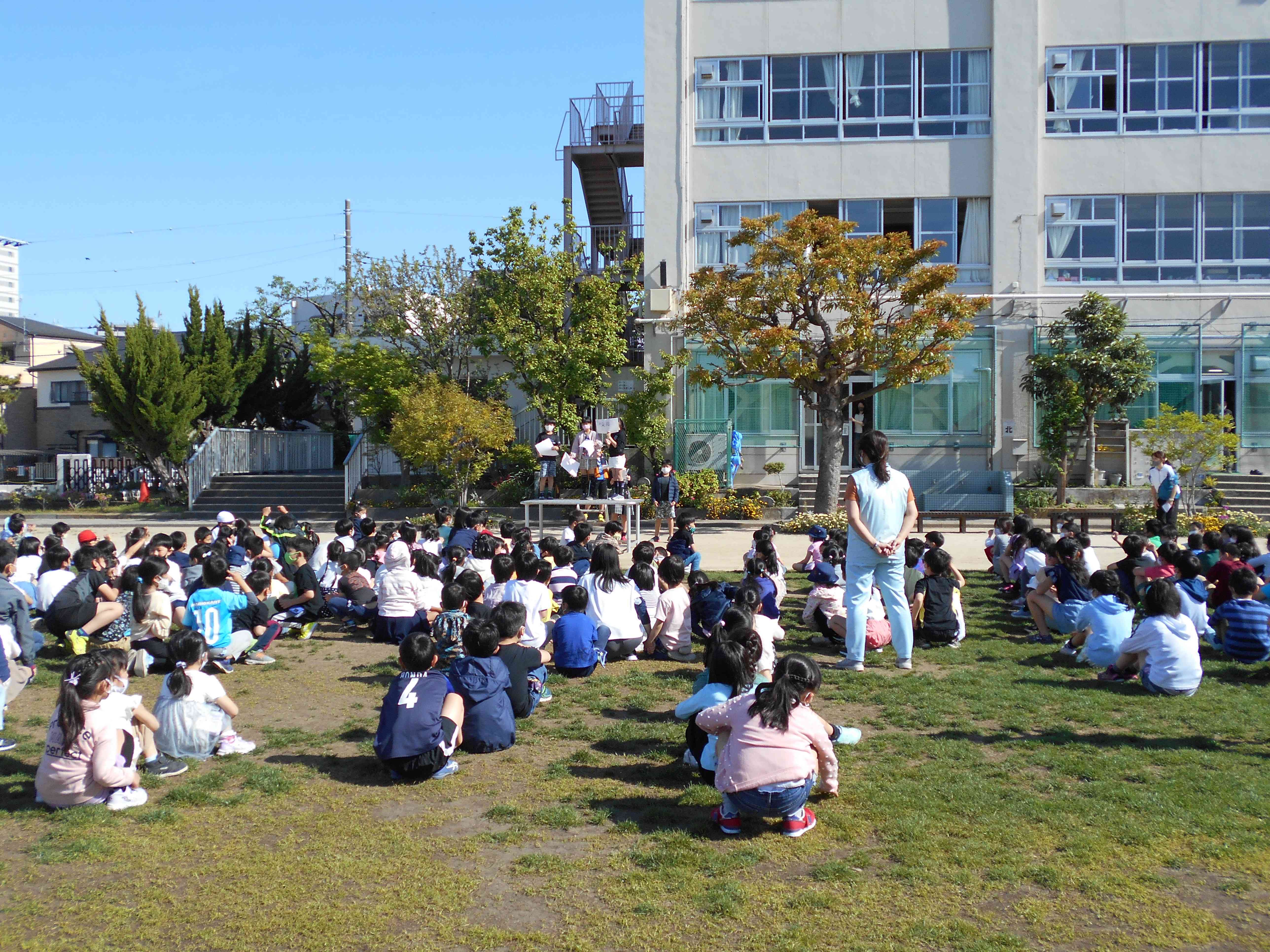 今日の児童集会は、久しぶりに全校が校庭に集まって行いました。好きな食べ物、好きな色、好きなスポーツの3つのヒントをもとに、どの先生かを当てます。回答は3択です。 ちなみに第1問は、 好きな食べ物は「すし」、好きな色は「緑」、好きなスポーツは「野球」です。 次の先生の中で、誰でしょう。 1.矢口先生 2.家鋪先生 3.校長先生 正解は・・・・のちほど。