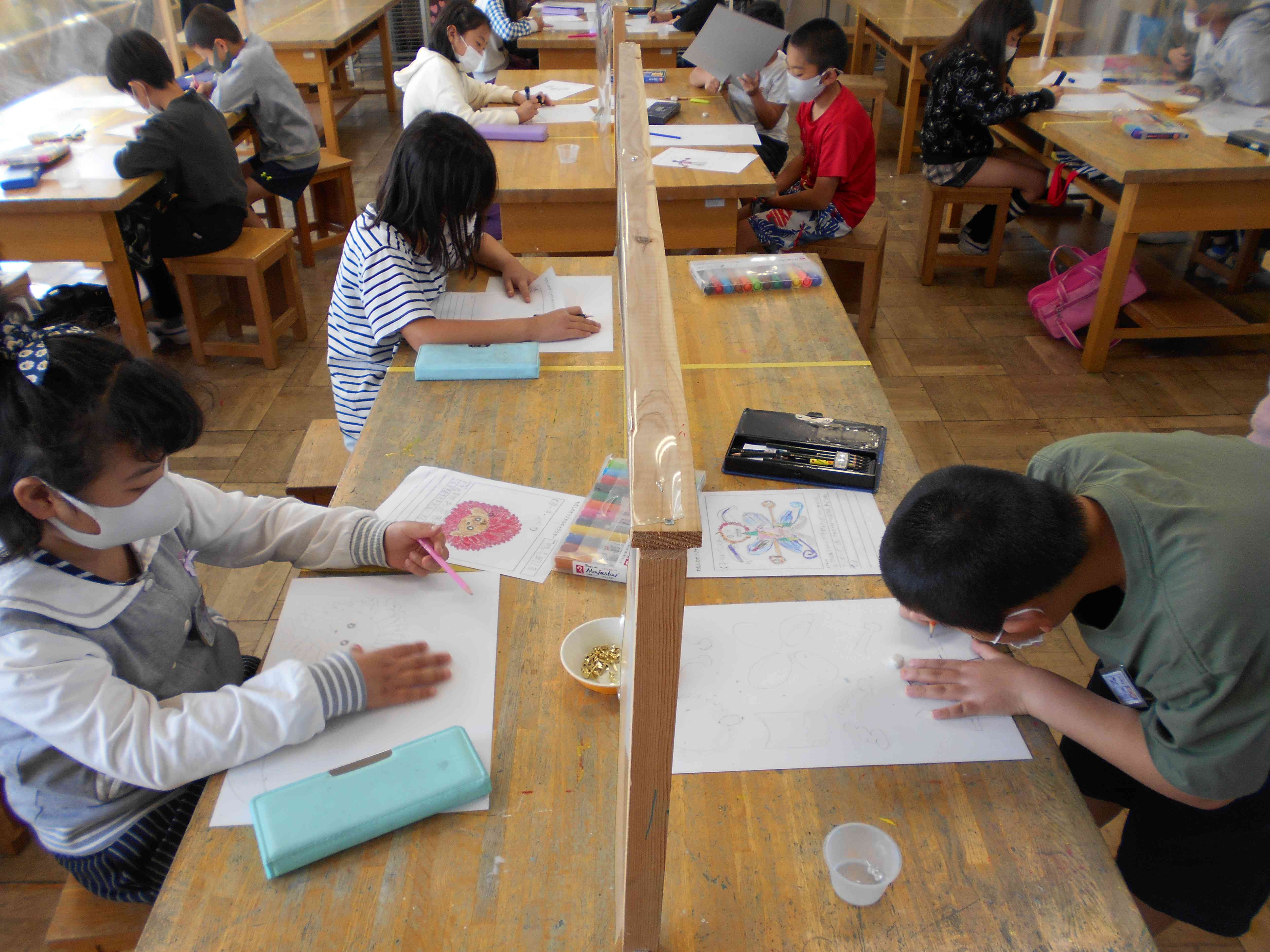 4年生の図工科「オリジナルキャラクターでリベットくん」の授業を見ました。前時に考えたオリジナルのキャラクターを厚紙に描きます。そのとき、頭や胴体、手や足のパーツを作り、それを割ピンで留めることで、関節が動かせるキャラクターができます。そして簡易アニメーションを作るという内容です。どのようなアニメーションができるのか楽しみです。