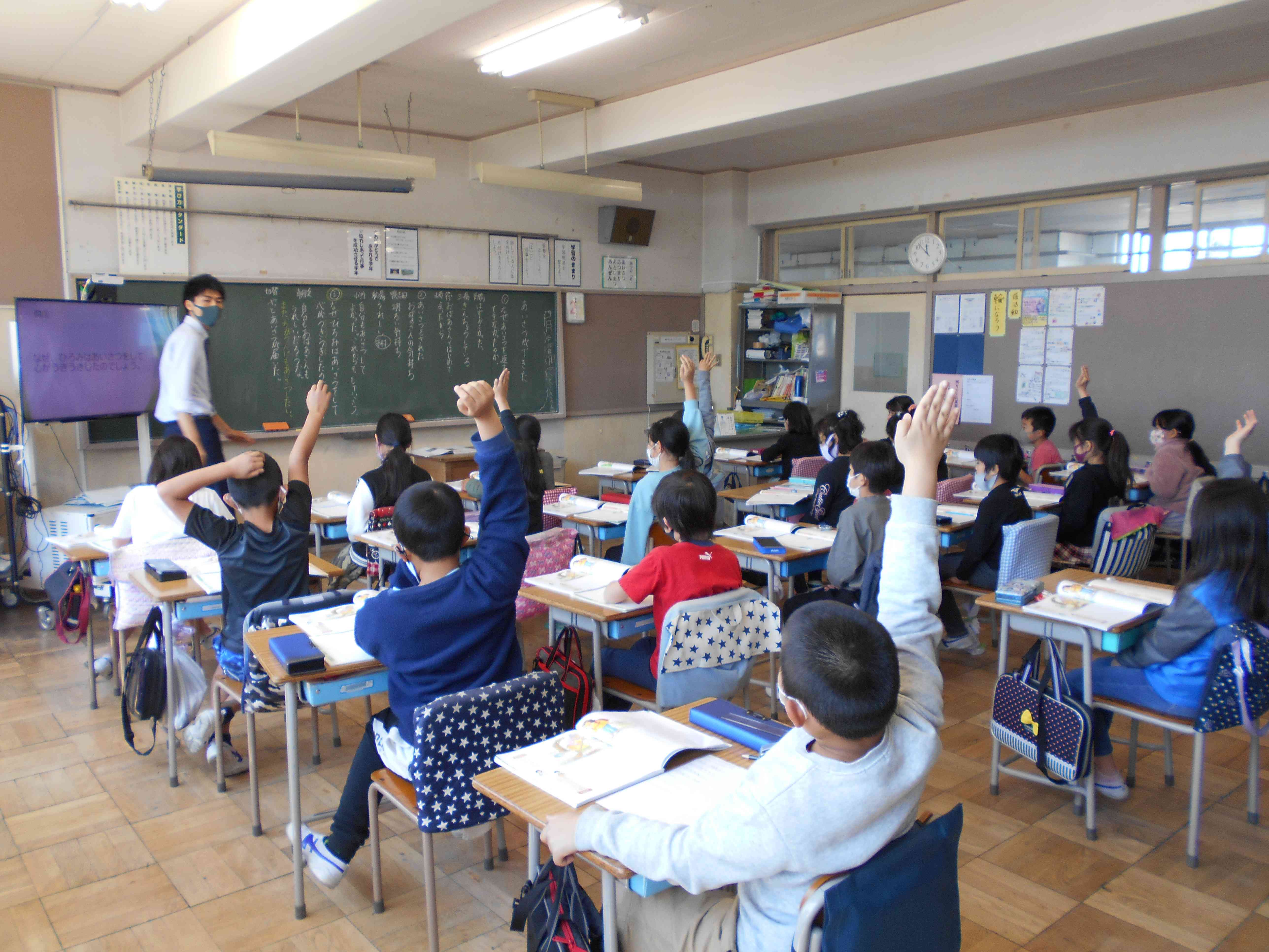 4年1組の道徳は「あいさつができた」です。通学途中に会ったおばあちゃんに挨拶をされて、挨拶を返すことができなかったひろみは、「ちゃんと挨拶すればよかったな。」と思います。別の日におばあちゃんと会ったときに、ひろみは「おはようございます。行ってきます。」と挨拶ができて、心がうきうきしたという話です。子供たちは、ひろみの気持ちを想像したり、自分の行動を振り返ったりして意欲的に発表していました。 ひろみは挨拶ができましたが、やろうと思ってもできない子はいます。「挨拶ができないと、大人の社会では通用しない。」と言う人はいますが、何でも大人の価値観で子供を見ようとすることには抵抗を感じます。挨拶ができることはもちろんよいことですが、できない子供の育ちをゆっくりと待ってあげたいと思います。【添付ファイル】