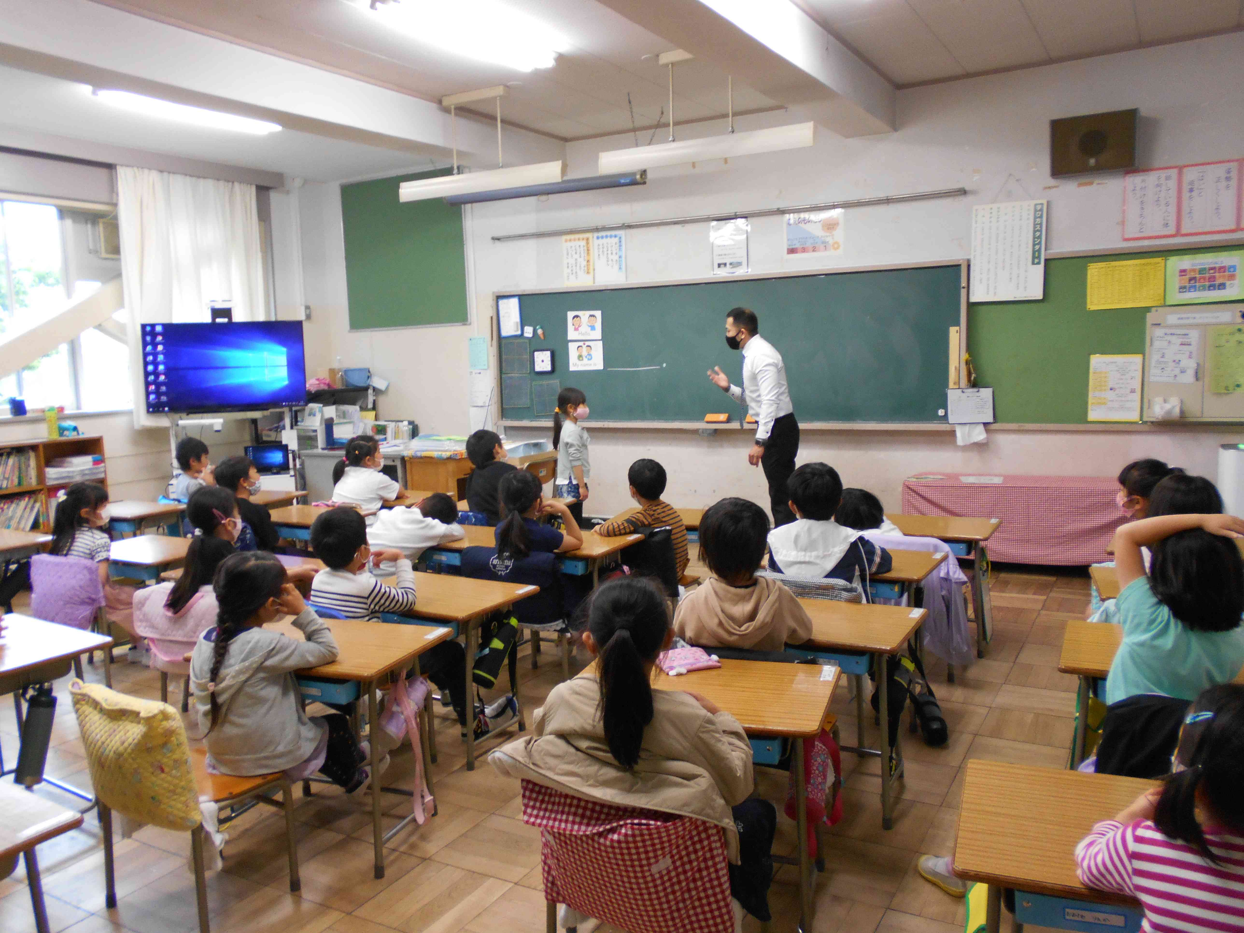 1年生の教室で英語の学習をしていました。My name is ~で、隣の席の友達と自分の名前を伝え合っていました。低学年の時から英語に慣れ親しむことで、中学年からの外国語活動や、高学年の外国語の学習に、意欲的に取り組めます。何年も英語を勉強してきても満足に話せない私には、今の子供たちが、とてもうらやましく思います。