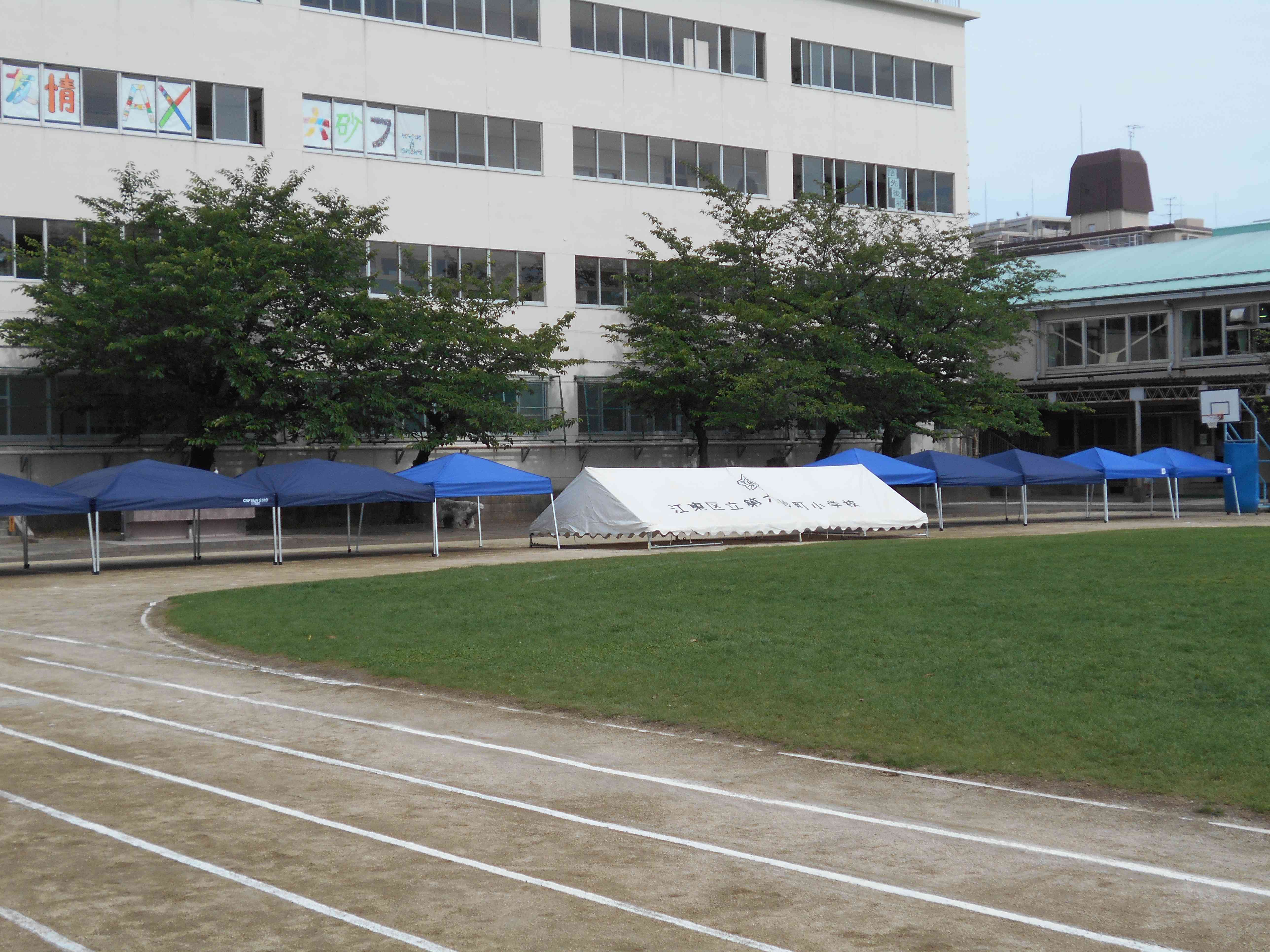 明日は暑くなりそうなので、児童席にテントを設置しました。スポフェスの準備は、明日の朝にテントを上げて、放送機器の準備をするだけです。 子供たちは、いつもより早く寝て、明日に備えましょう。 保護者の方は、明日の来校の際に必ずチケットをお持ちください。また、熱中症を防ぐために、水筒や帽子、保冷剤や冷却タオルを用意するなどの対策をお願いします。 明日は楽しく、思い出に残る1日にしましょう。