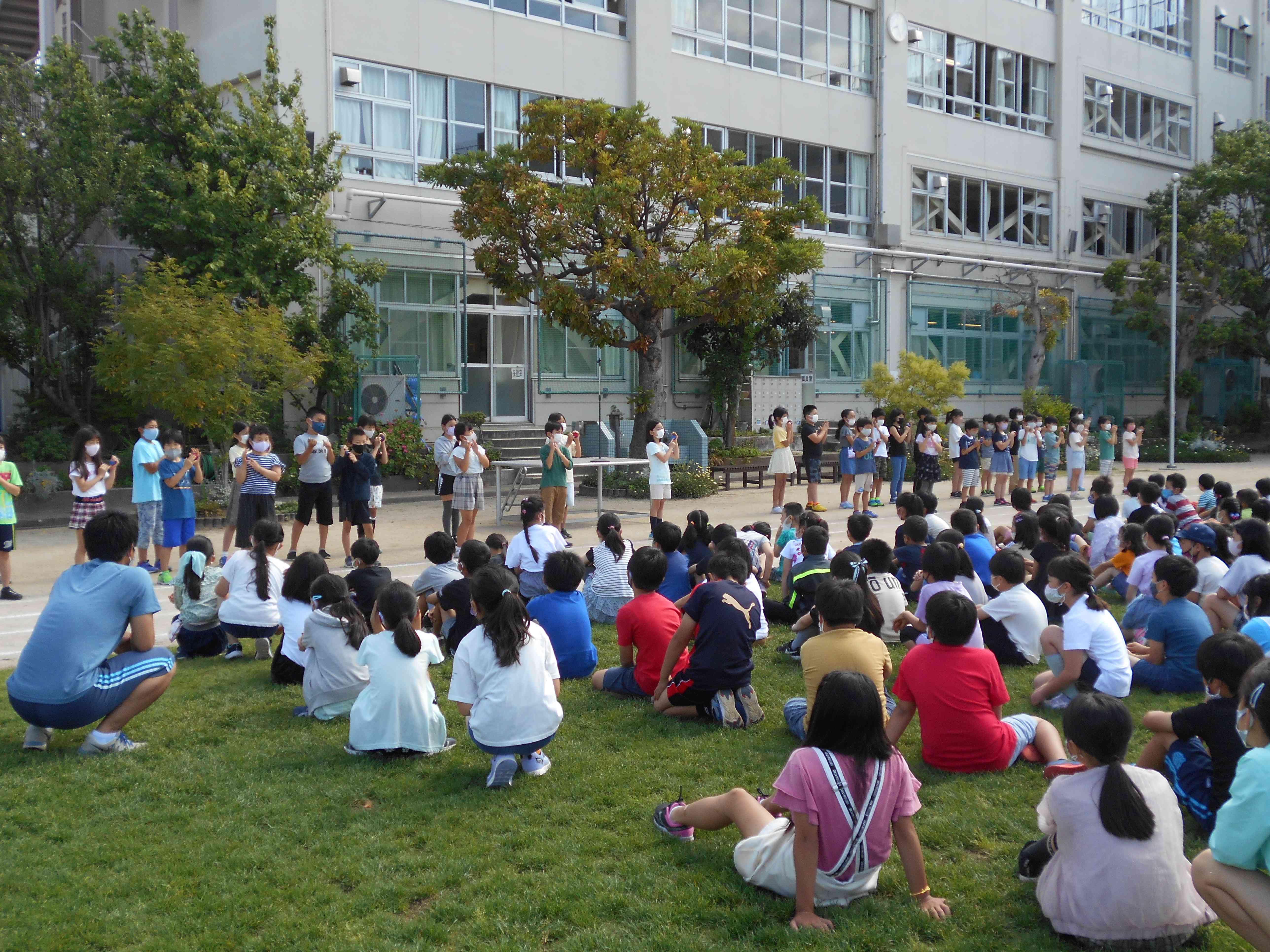 今日の音楽朝会は、全校児童でリズムゲームをやり、その後に4年生の発表を聴きました。 リズムゲームは、小川先生が打つ2種類のリズムを聴き、それに合わせて「手を上げる・ピースをする」の動きをします。もし、2種類のリズムと違うときは、腕でバツを作ります。よく聴いて、素早く動くのですが、間違えた人はその場に座ります。最後まで残った人に拍手が送られました。その後は、いよいよ4年生の発表です。「紅蓮華」の曲に乗って、カスタネットの演奏をします。全校で一番カスタネットの演奏が上手な4年生は、ただ叩くのではなく、特別な打ち方をします。みんなよく知っている曲で、調子の良いカスタネットの演奏が加わって、楽しく聴くことができました。演奏してくれた4年生に、大きな拍手が送られました。 次はどこの学年が発表するのでしょう。次の音楽朝会も楽しみです。【添付ファイル】