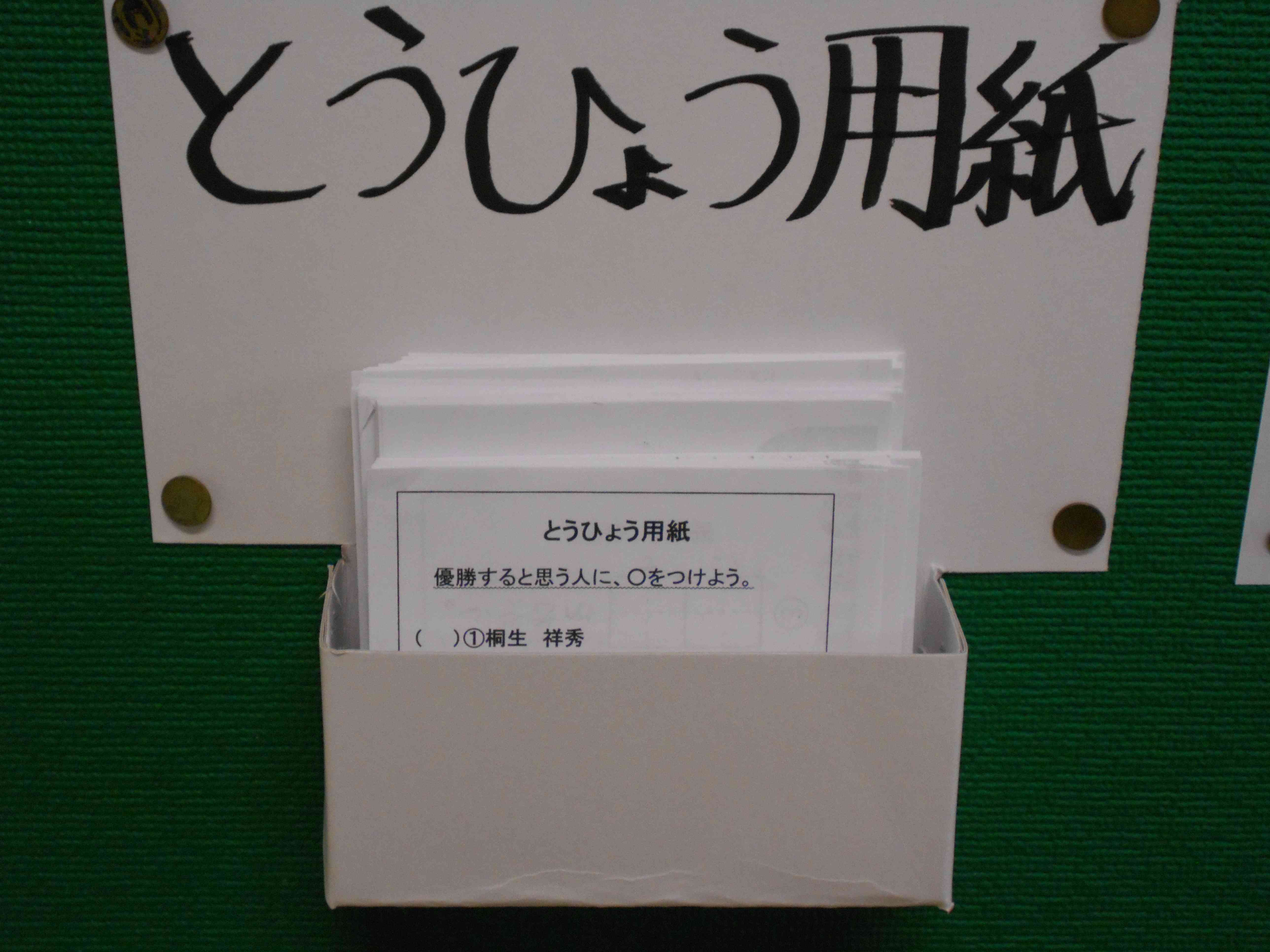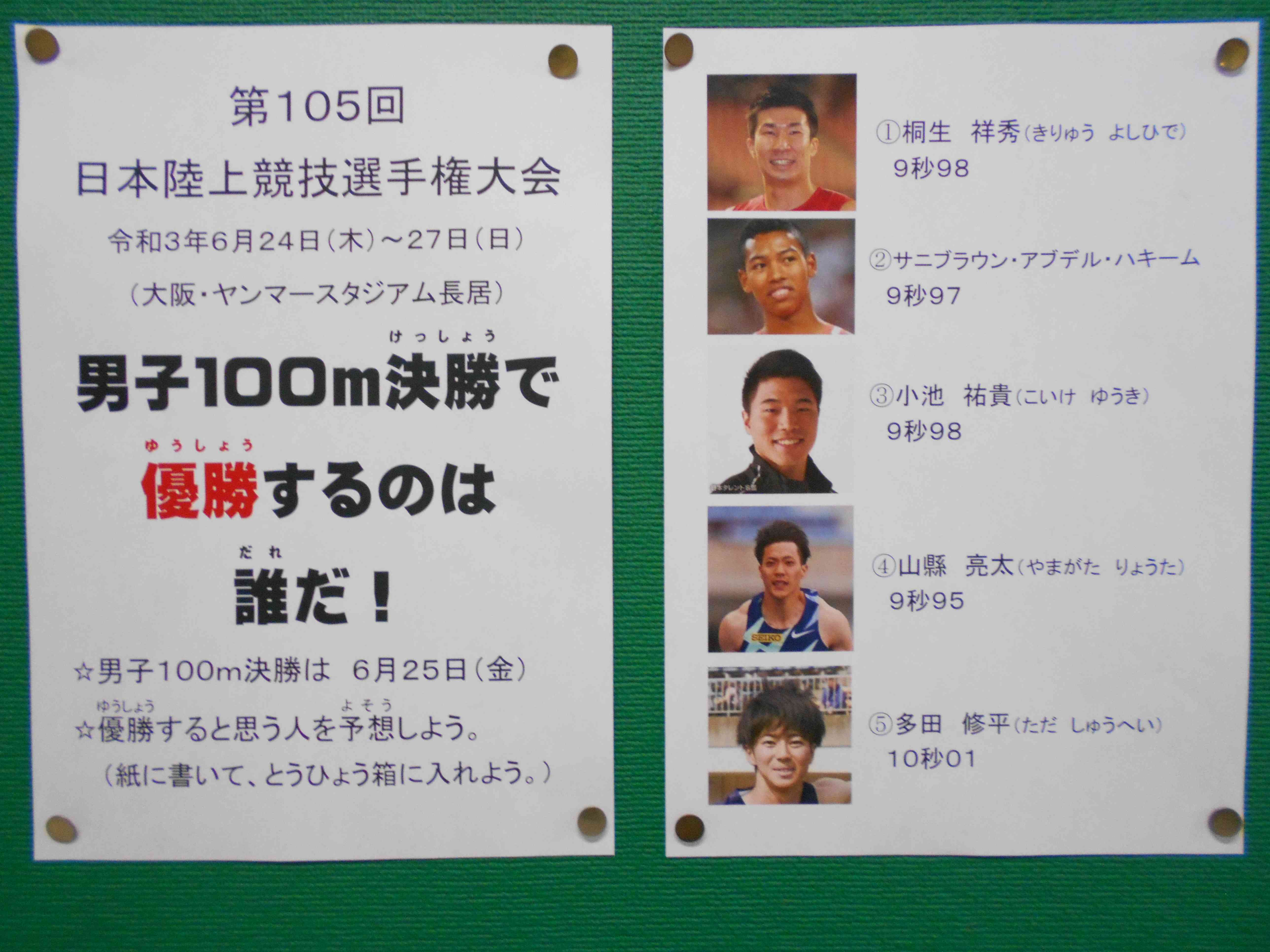 オリンピック・パラリンピックの掲示板に、日本陸上競技選手権大会男子100m決勝の優勝予想の投票箱を置きました。予想は明日から6月21日(月)まで受け付けます。 ※投票ができるのは、本校の児童と職員のみです。