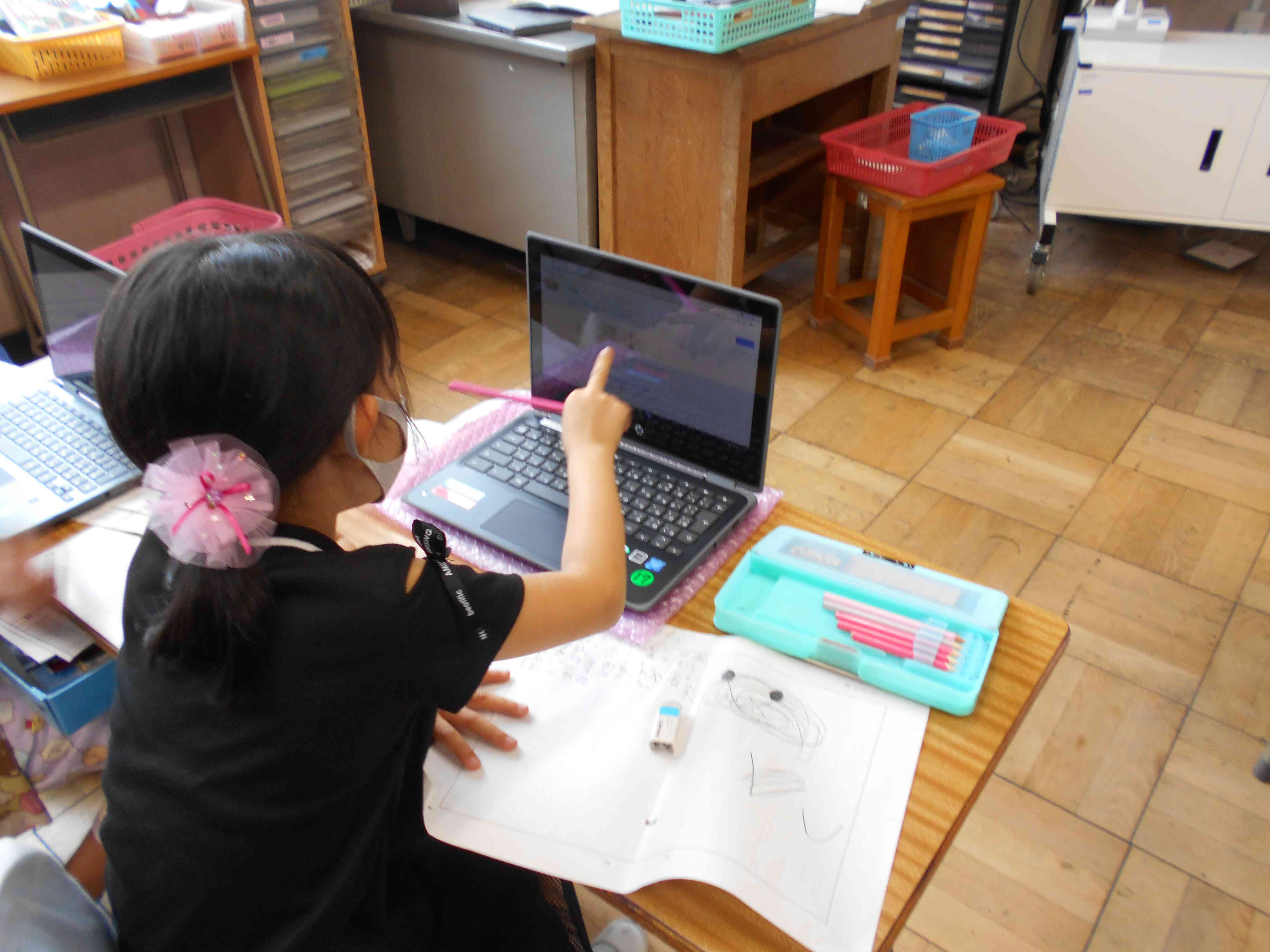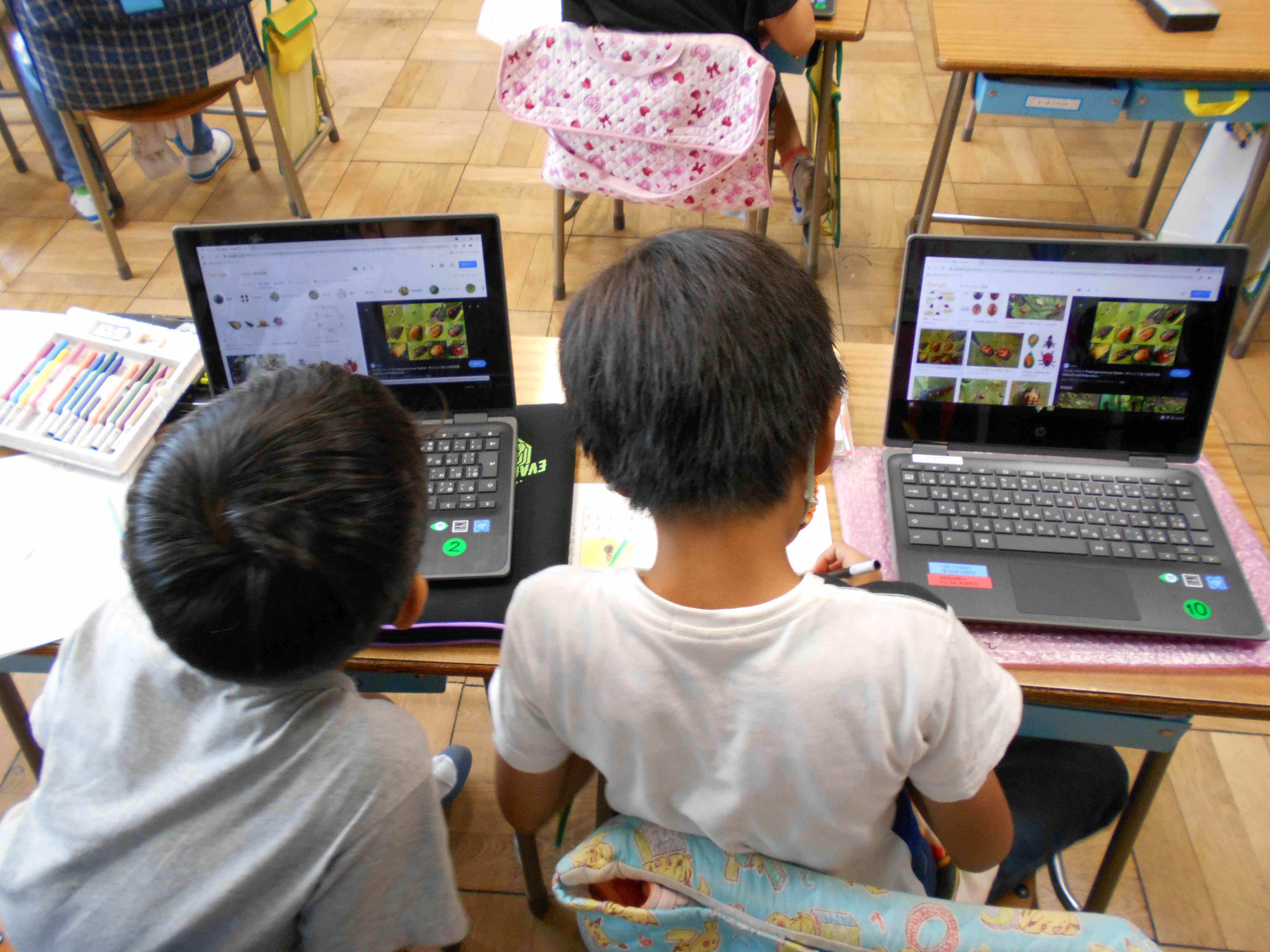 生活科の学習でしょうか。自分が調べたい生き物についてタブレットを使って調べ、わかったことをまとめています。扱いにとても慣れていて、どんどん自分のペースで学習を進めています。