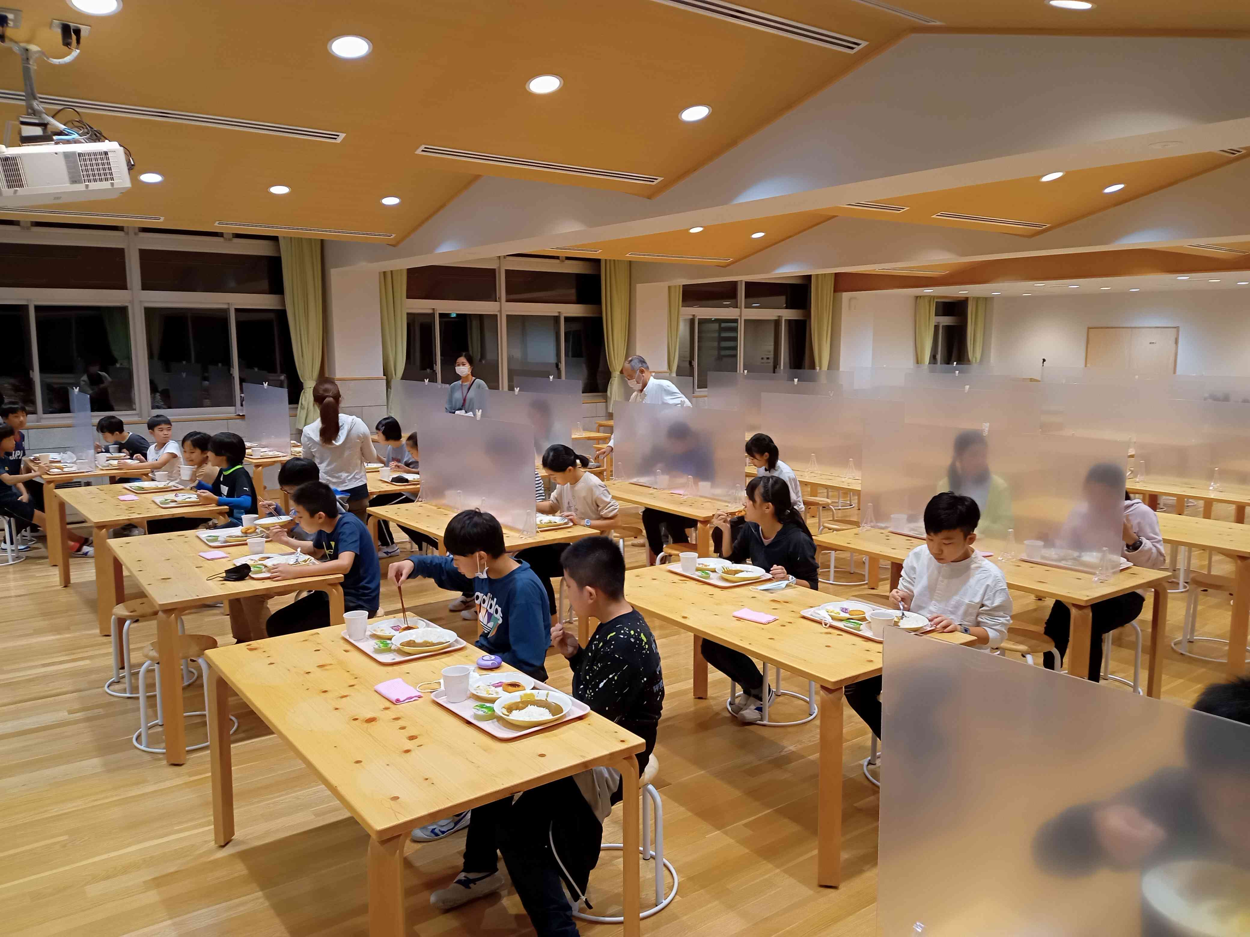 夕食はカレーライス。いただきますから数分でおかわりをする子も。カレーは飲み物ではありません。よく噛んで食べましょう。