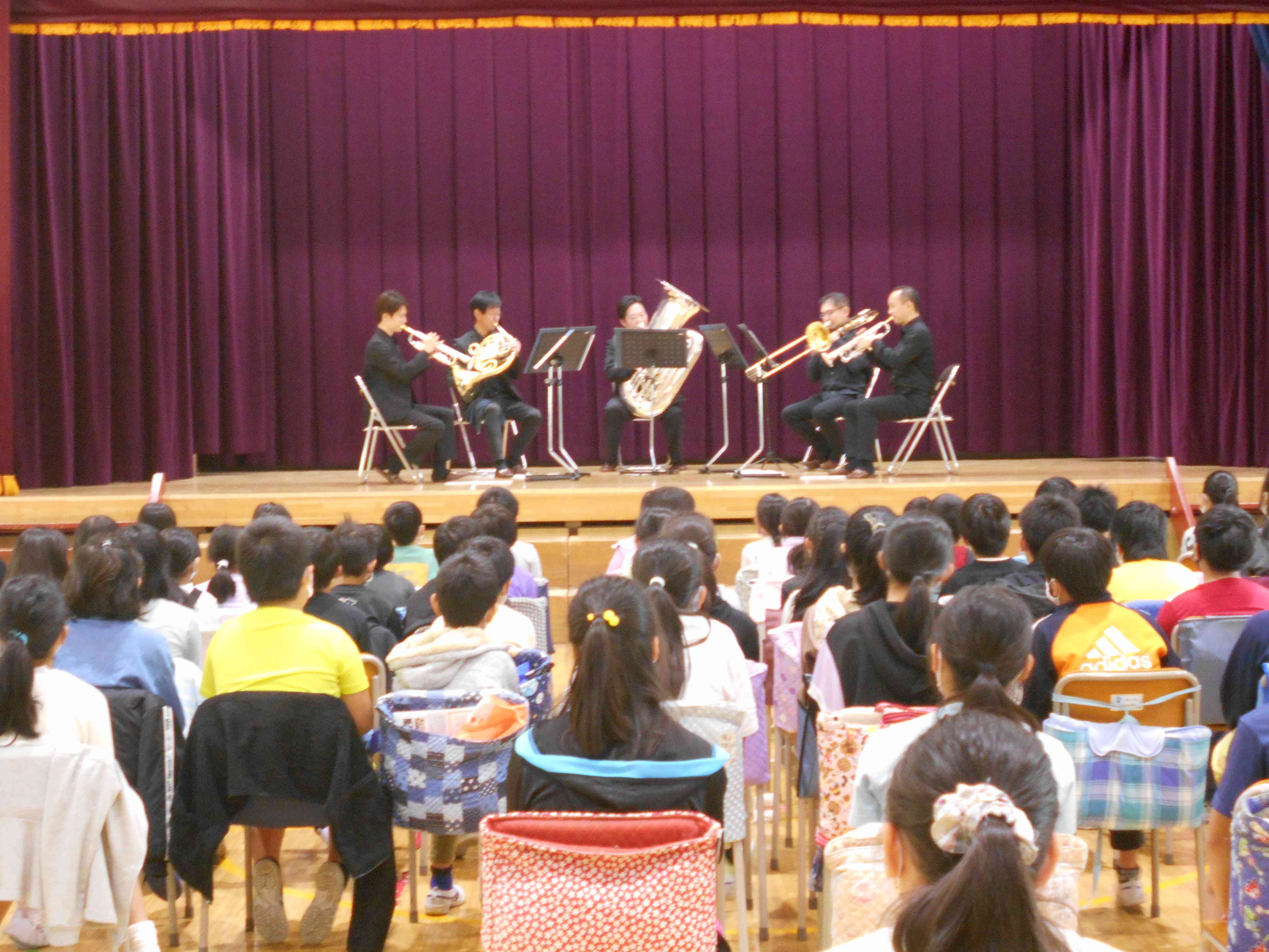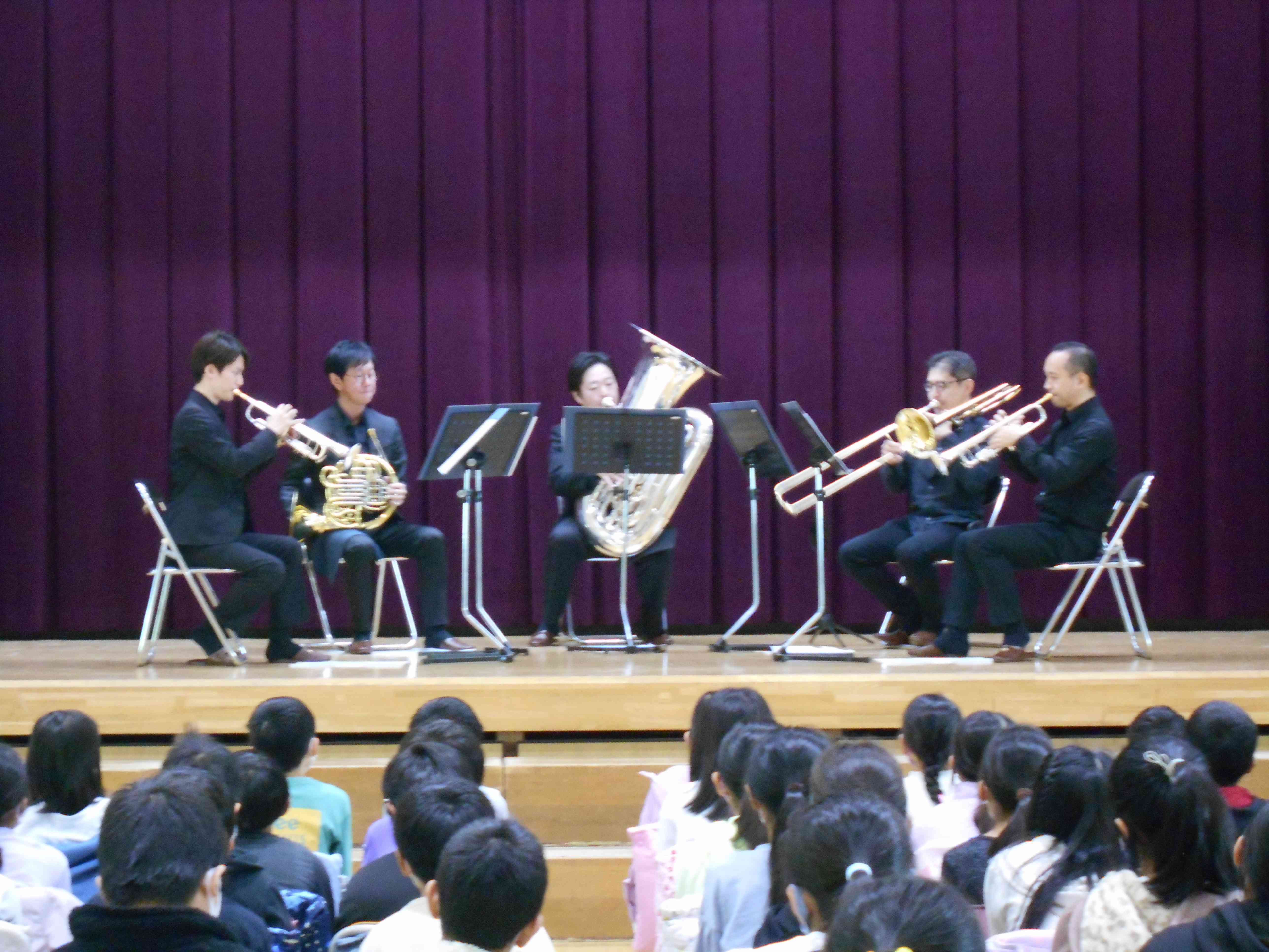 4年生、5年生、6年生がアウトリーチコンサートの鑑賞をしました。 直近で見る金管楽器やその音色に、子供たちは興味津々の様子でした。 「吹いていて、息は苦しくなならないですか?」 「押すところが3つしかないのにどうやって音を変えているんですか?」 「息はどれぐらい長く続きますか?」 「何歳から始めたんですか?」 沢山の質問に答えていただきました。 鼓笛に参加している子供たちも、良い音を聴いて練習の意欲が高まったようです。【添付ファイル】