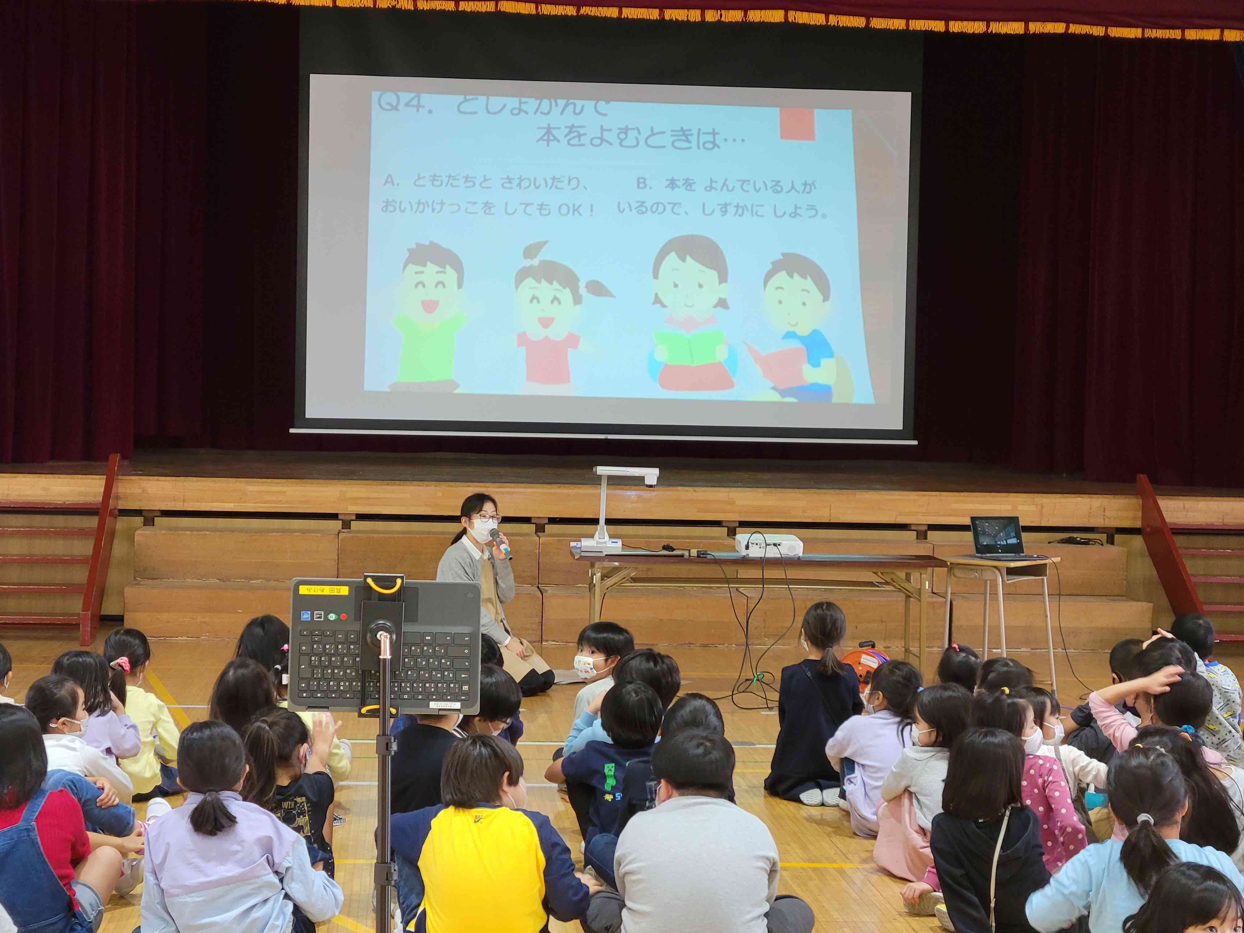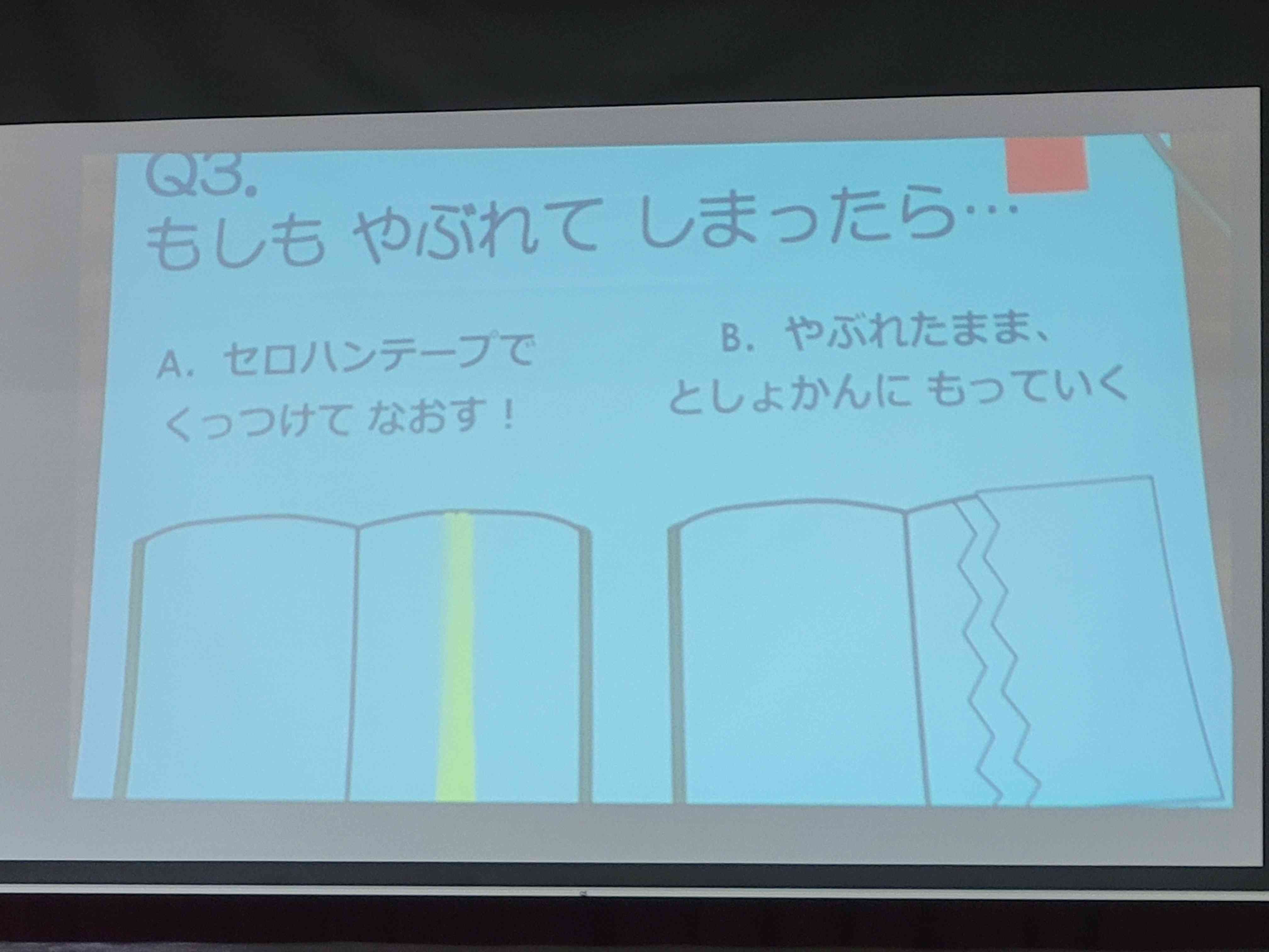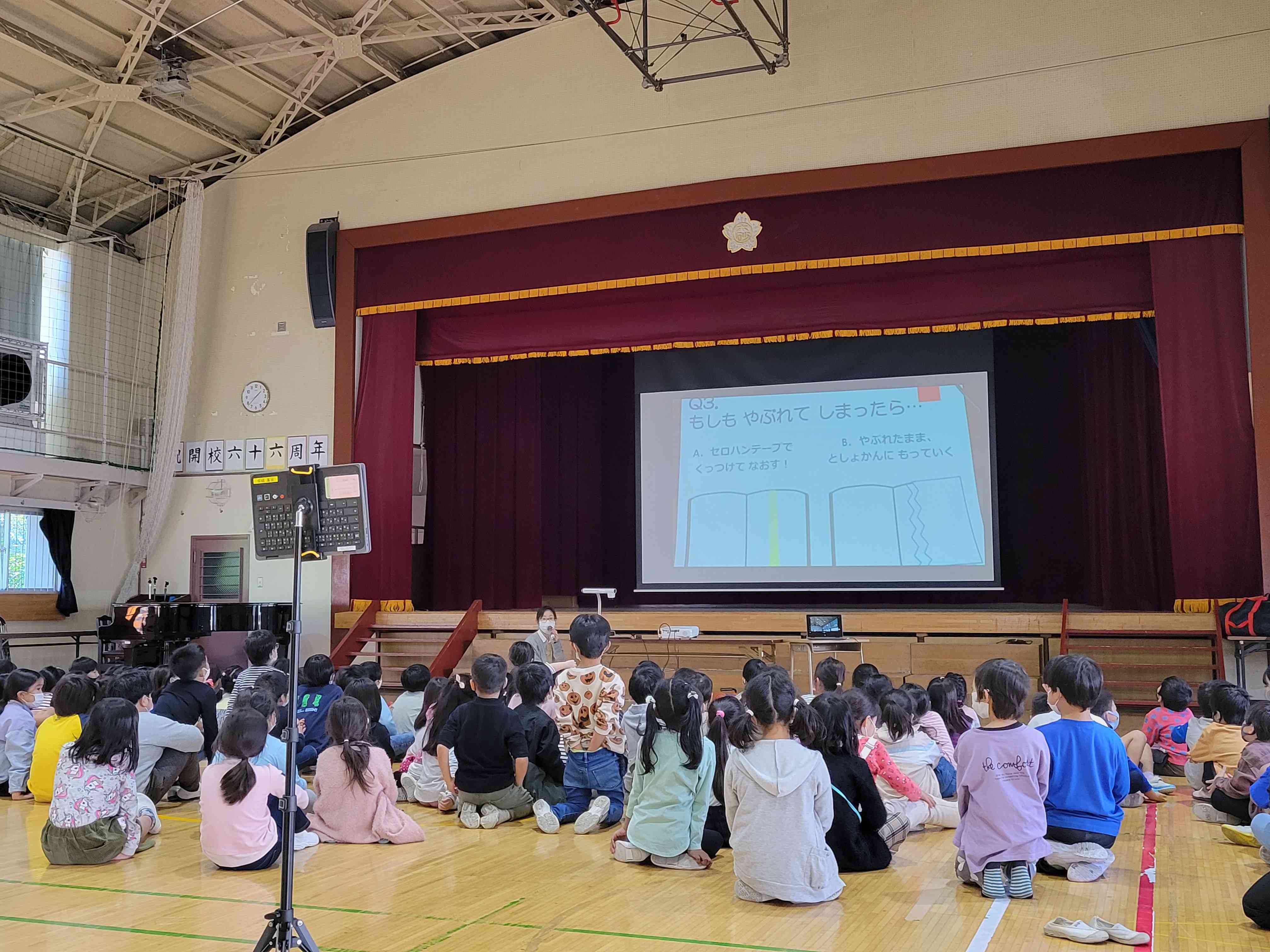1・2年生に、図書館出張授業が行われました。 パネルシアターも交えて、図書館での過ごし方や本との付き合い方を教えていただきました。 破れたページは、普通のセロハンテープでとめてはいけないのですね。勉強になります。特別な専用テープでとめるのだそうです。 知っているつもりだったことも「へぇー、そうだったんだー!」と目から鱗の時間でした。 また、図書館を身近に感じられたことが、何よりも大きな収穫でした。 秋の夜長に、本好きさんが一層増えるといいなと思います。【添付ファイル】