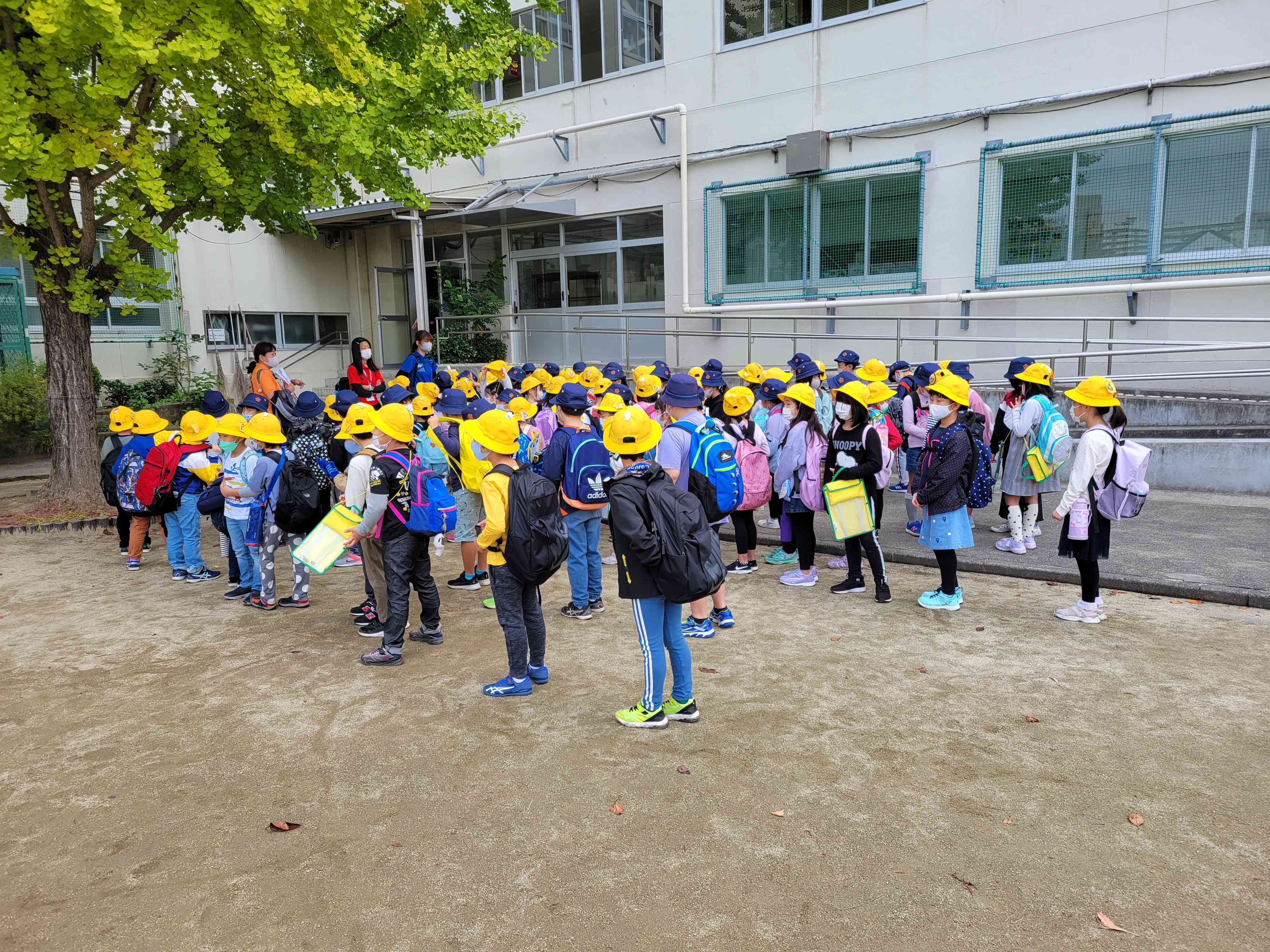 全校朝会の後、1・2年生は生活科見学のために、猿江恩賜公園へ出発しました。