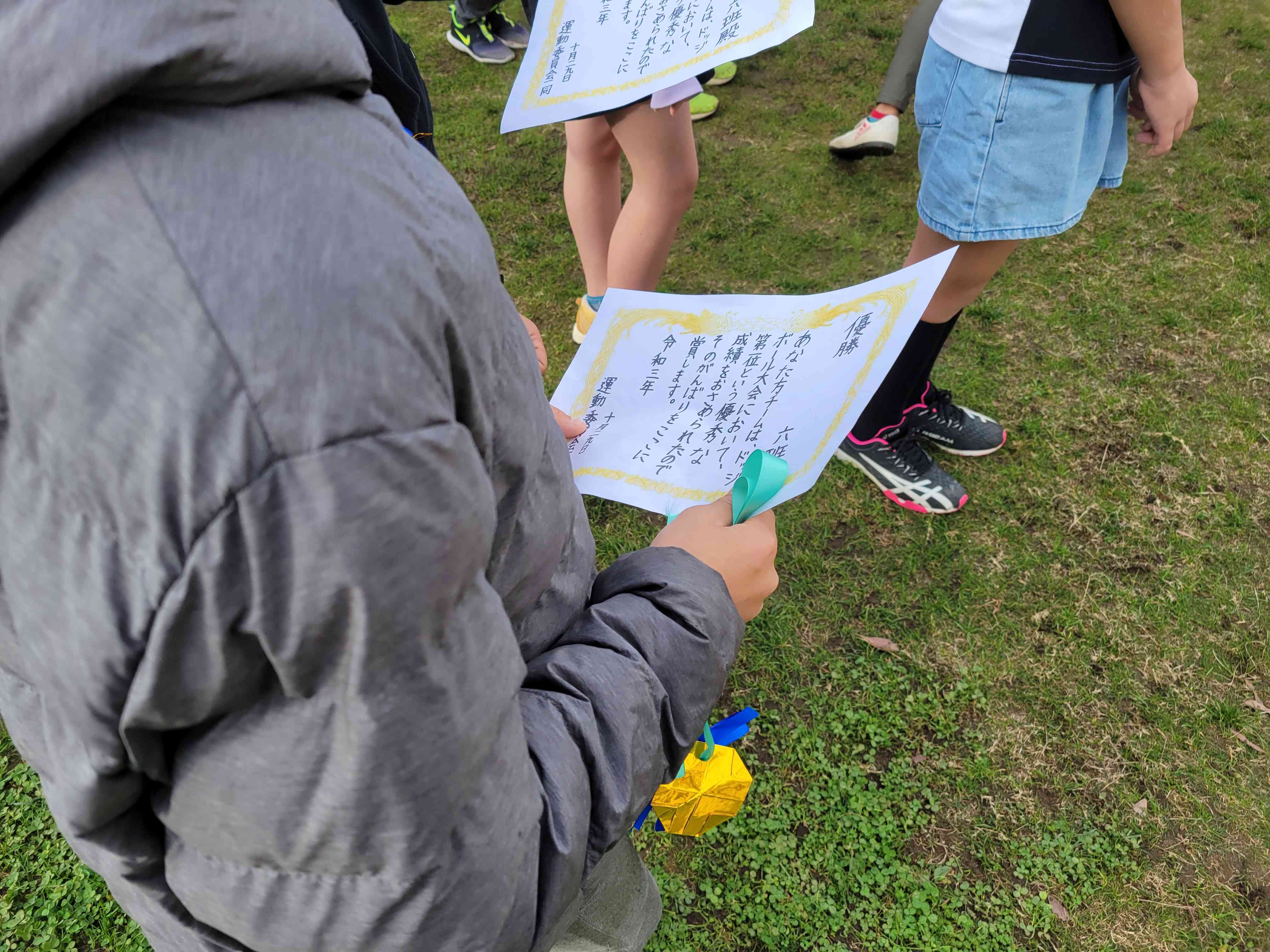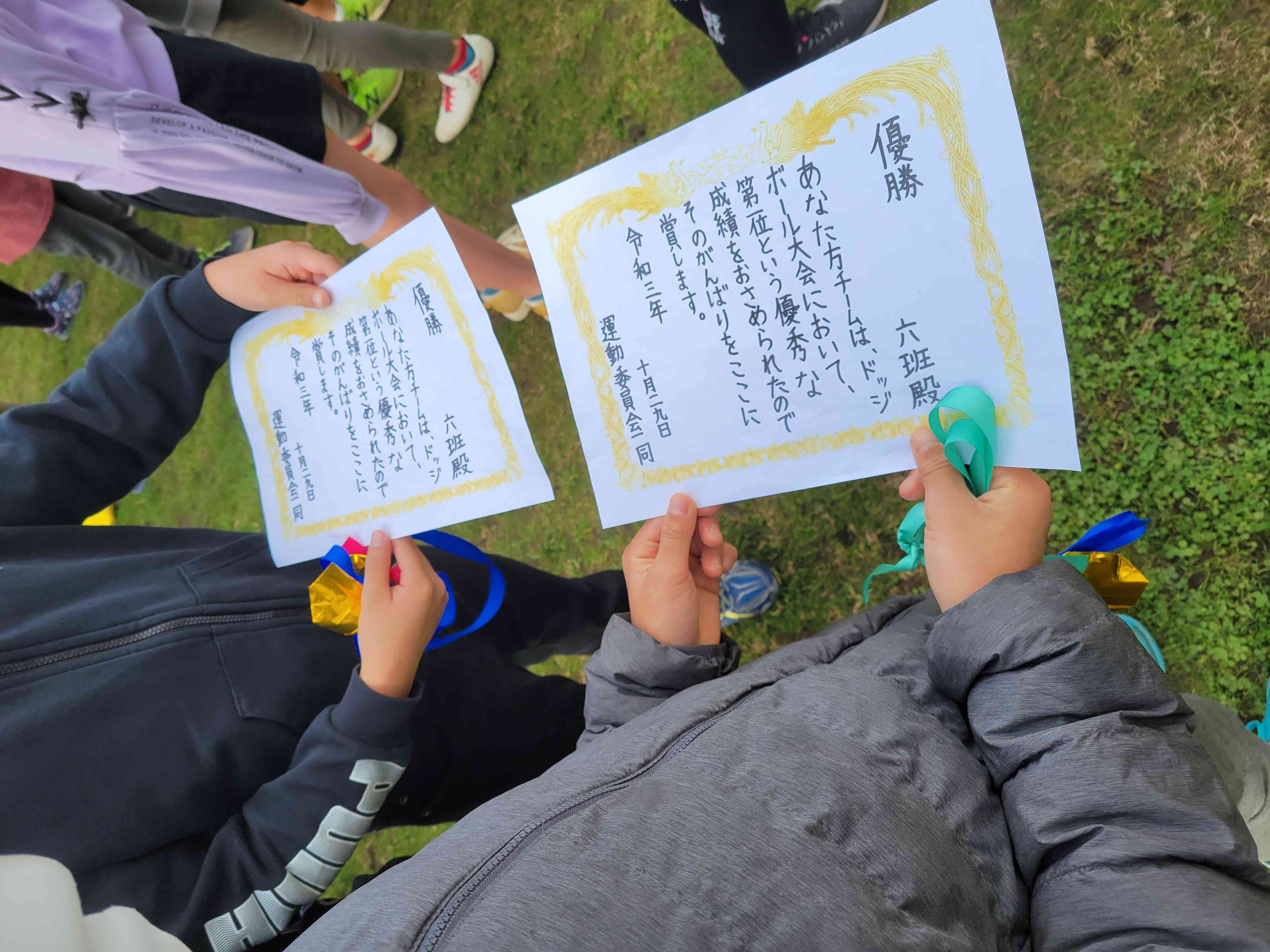 全校朝会で、なかよし班ドッジボール大会の表彰がありました。 運動委員会の児童が企画・運営した大会です。緊急事態宣言などで実施が難しい時期もありましたが、応援をMeetに切り替えるなど工夫をし、全校を楽しませてくれました。 優勝したチームには、表彰状とメダルの授与がありました。
