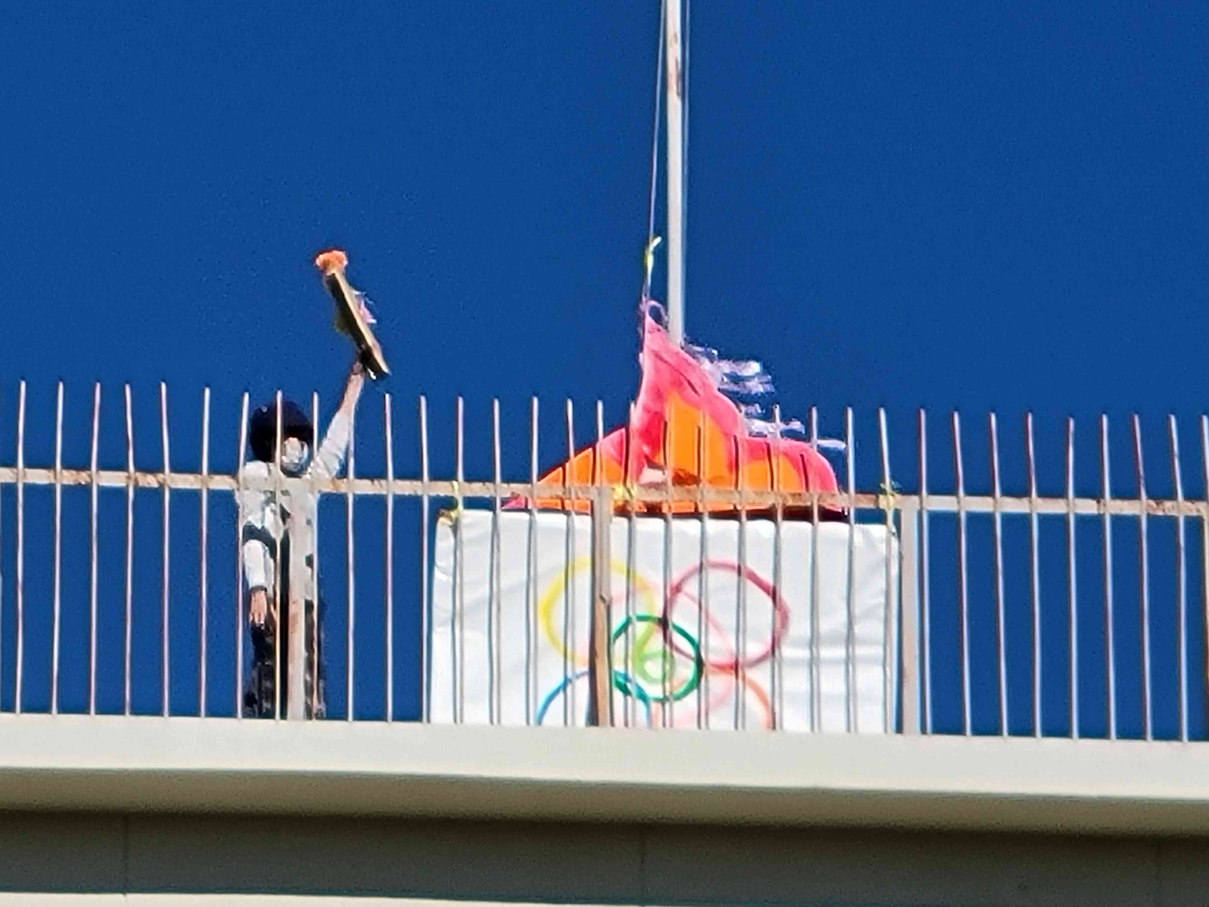 屋上の聖火台に注目していると、なんと、最終ランナーが聖火点灯! 聖火が燃え上がり、全校から歓声があがりました。