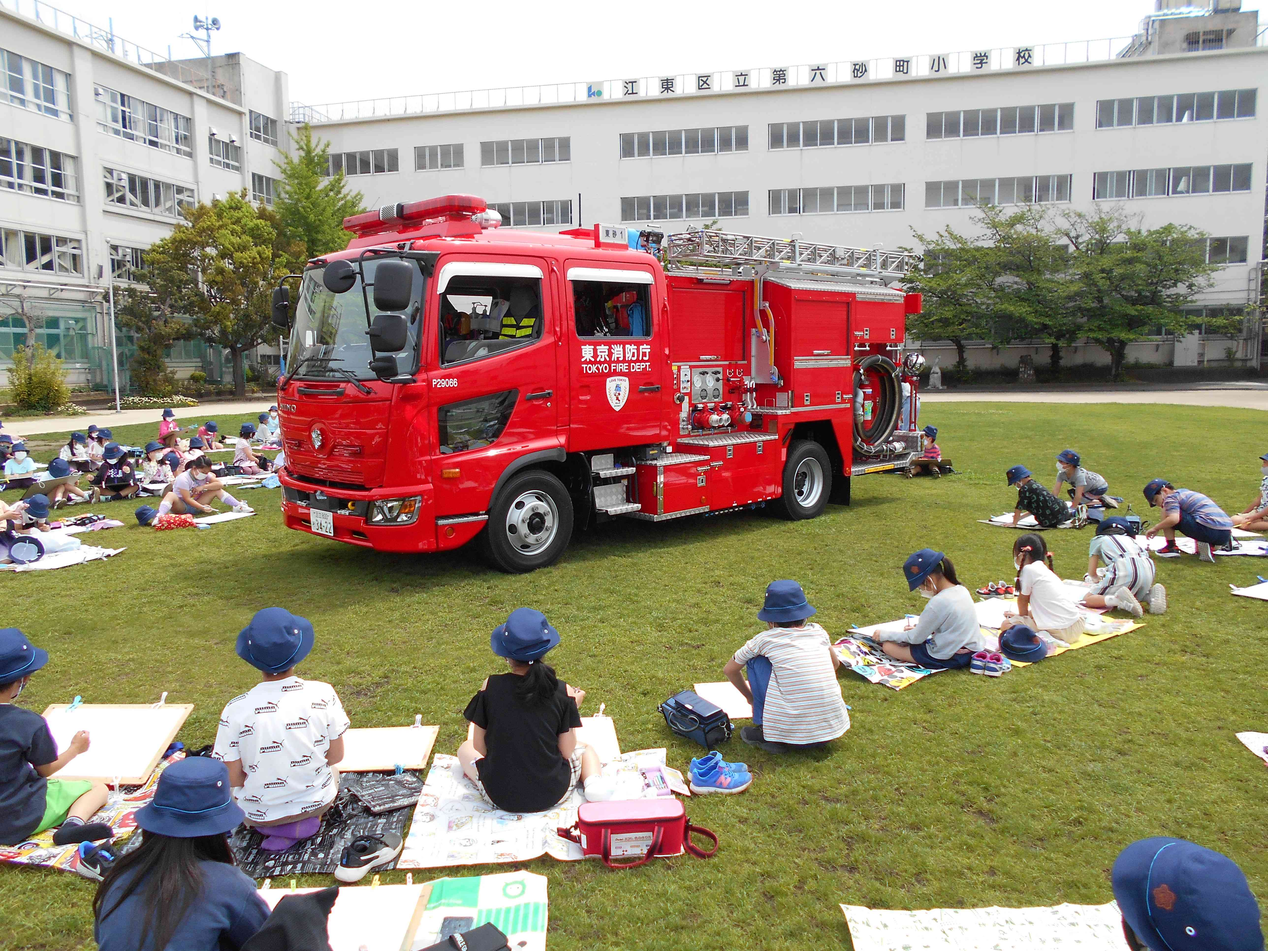 2,3年生は消防写生会を行いました。 校庭の芝生の中まで、大きな消防車と 消防団の小さなポンプ車が入ってきて、 児童はその周りで絵を描きました。