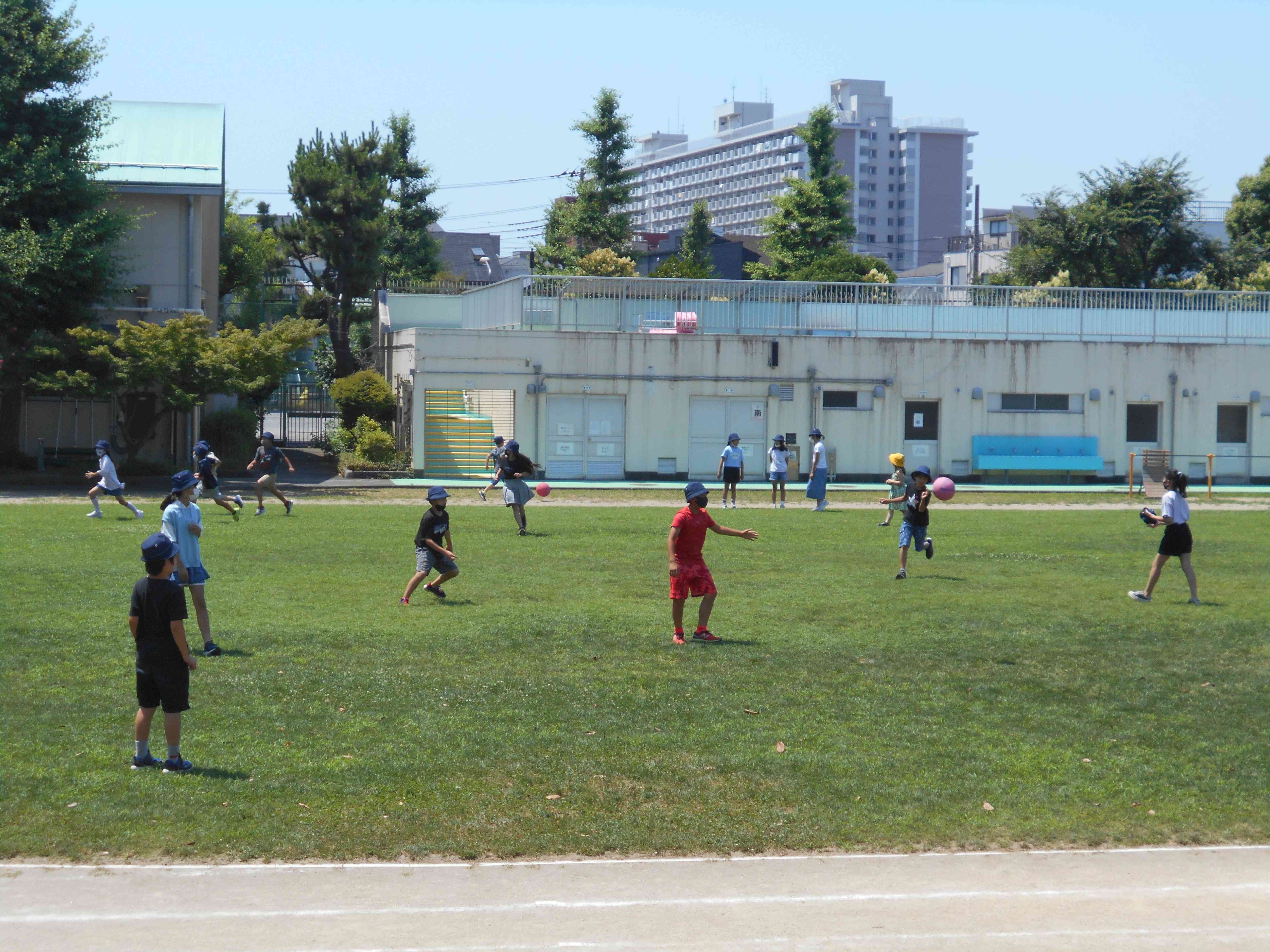 昼休みの外遊びを朝遊びに変更しましたが、中休み(10:20~10:40)も気温が高く、今日の外遊びは10分間に短縮しました。こんな暑さの中でも、元気な子供たちは休み時間になると校庭に飛び出します。ただし、熱中症を予防するためにマスクは外すように呼びかけました。