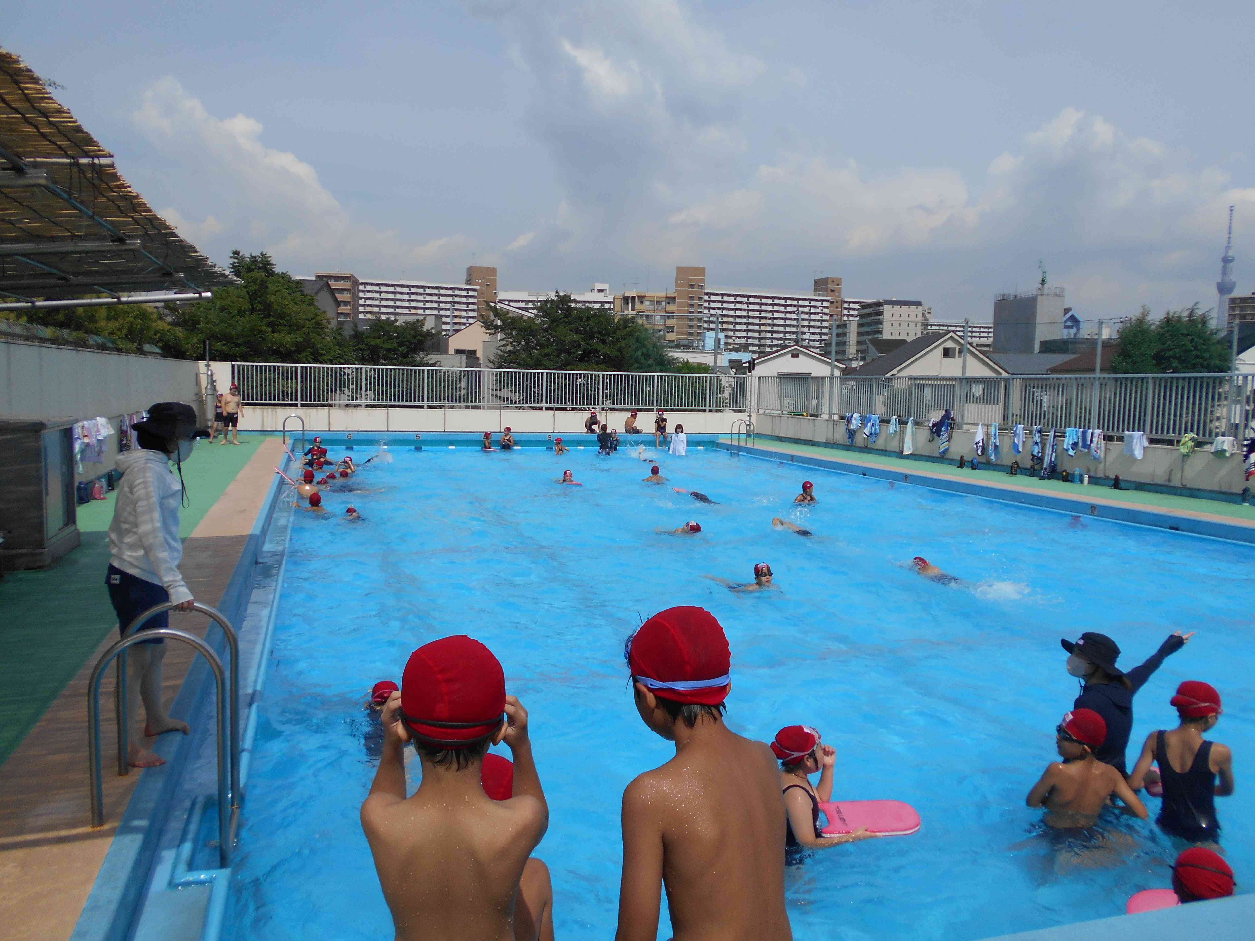 7月21日より夏季水泳教室が始まりました。コロナの感染者数が増えている中ですが、参加率は50%程度と、多くの子供たちが参加しています。夏季水泳教室の指導時間は、体育の時より短いため、級別の指導を中心に行っています。一人一人が自分に合った練習をしながら、泳力の向上に励んでいます。