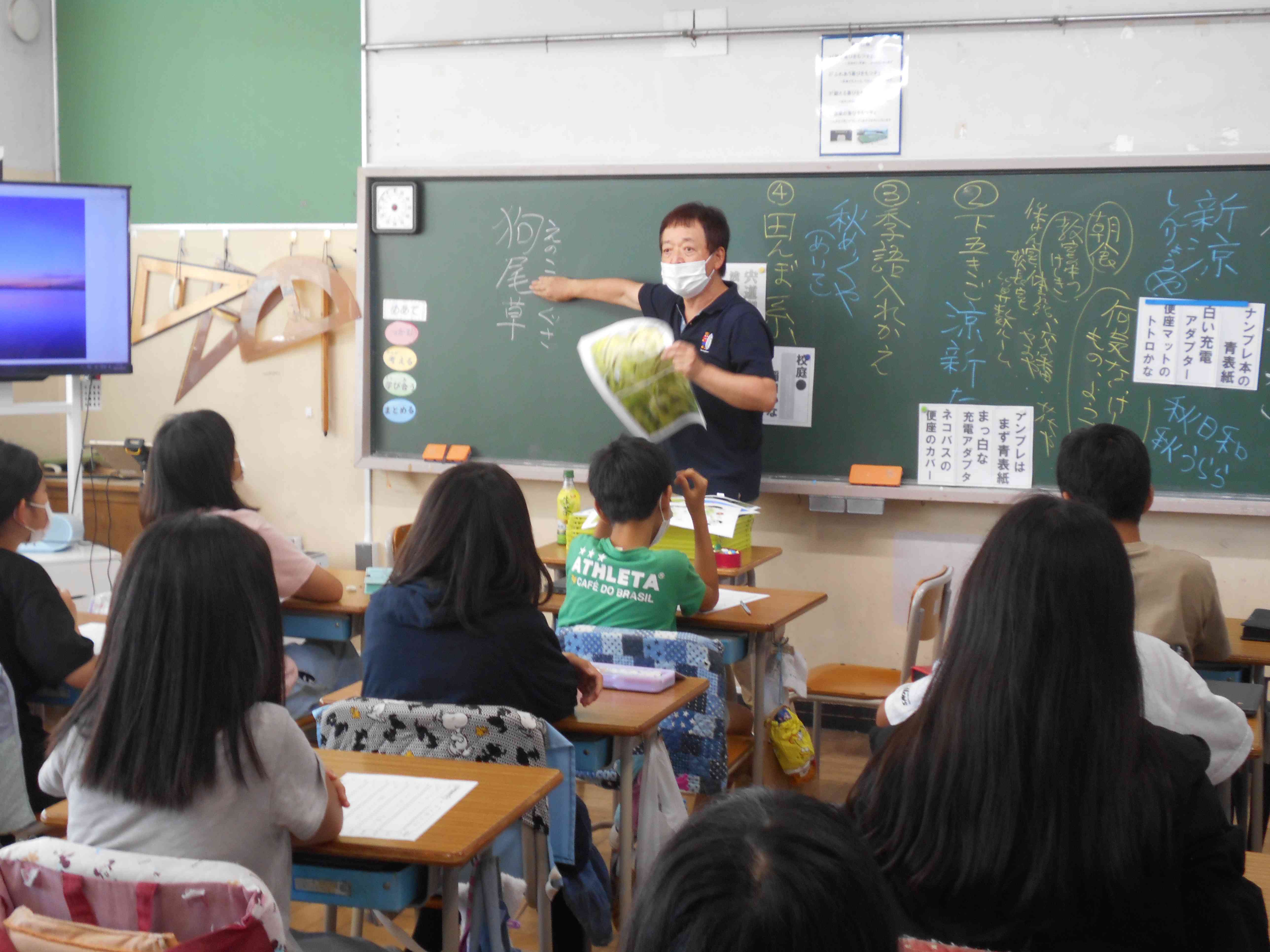 土田先生による秋の俳句授業です。秋らしく、エノコログサ(通称:ねこじゃらし)を使った俳句もできました。よくねこじゃらしと呼ばれますが、犬の尾に似ているので、犬ころ草→エノコログサという名前が付いたそうです。 学校の花壇にはエノコログサやメヒシバがたくさん生えています。どちらの草も穂を使って遊ぶことができますが、本校の子供たちが遊んでいる姿を見たことがありません。遊び方を知らないのでしょうか。