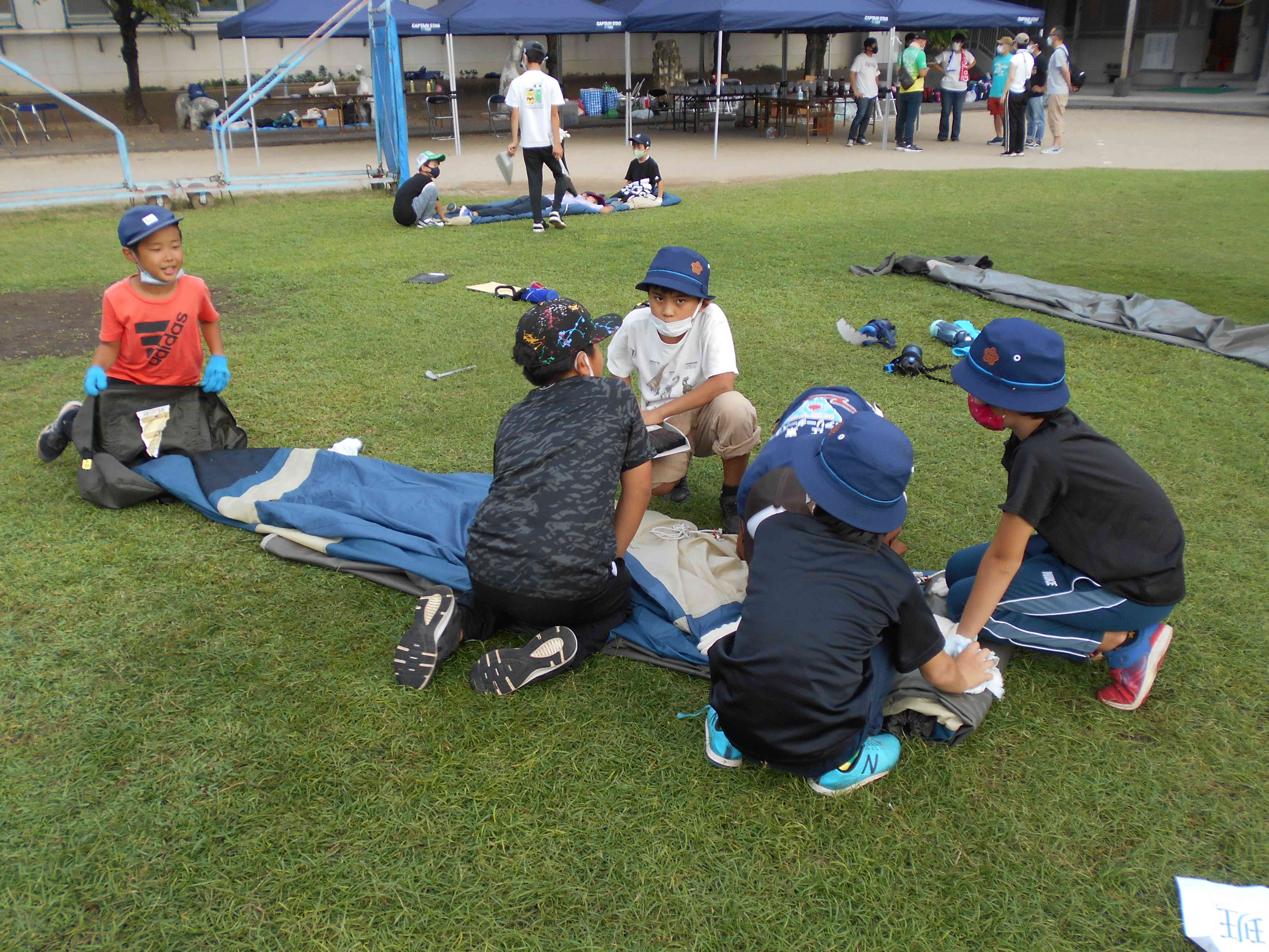 テントの片付けをしています。 次に使う人のことを考え、雑巾できれいにしながら畳んでいます。袋に入るように、みんなで空気を抜きながら小さく畳んでいます。