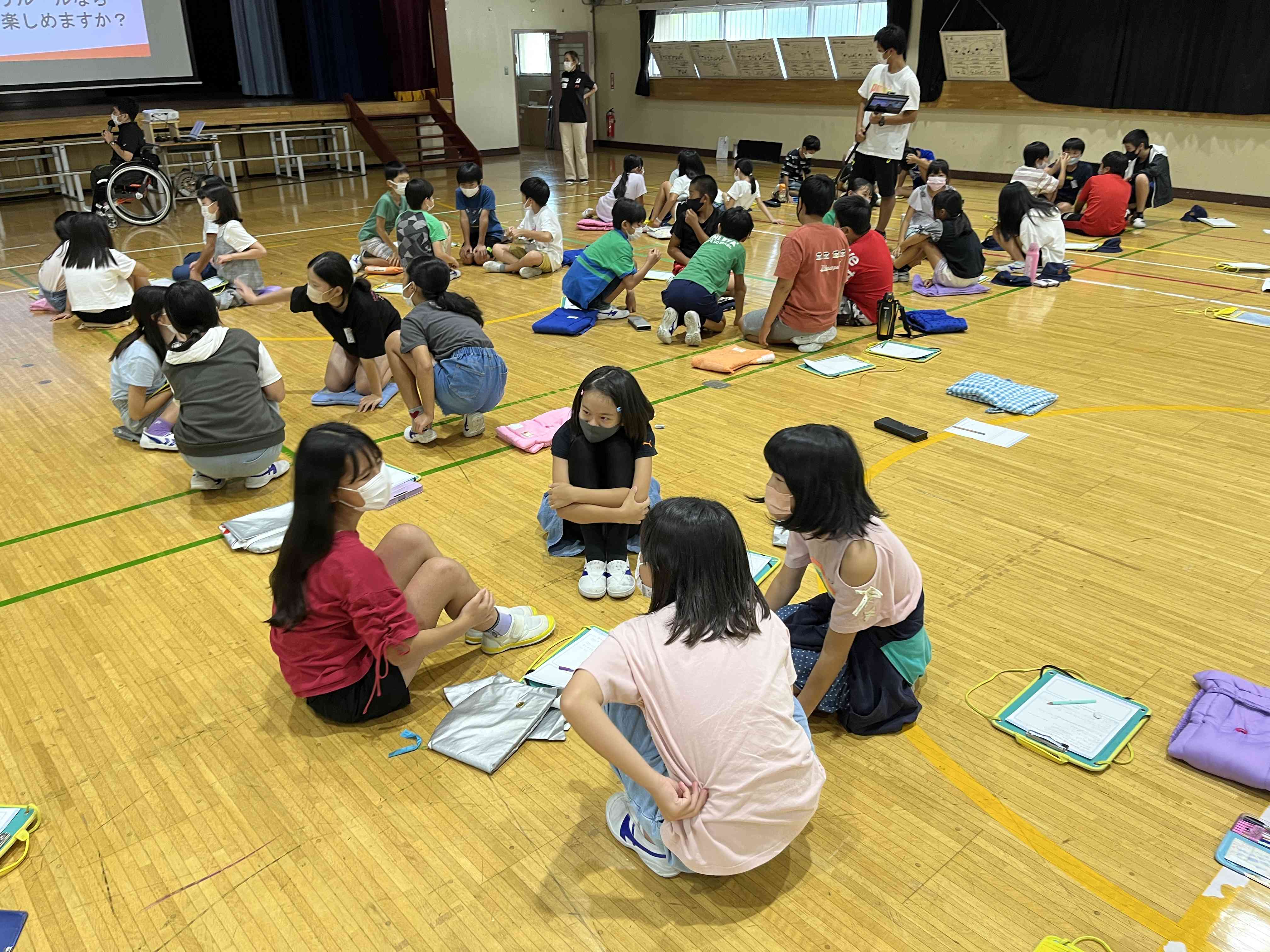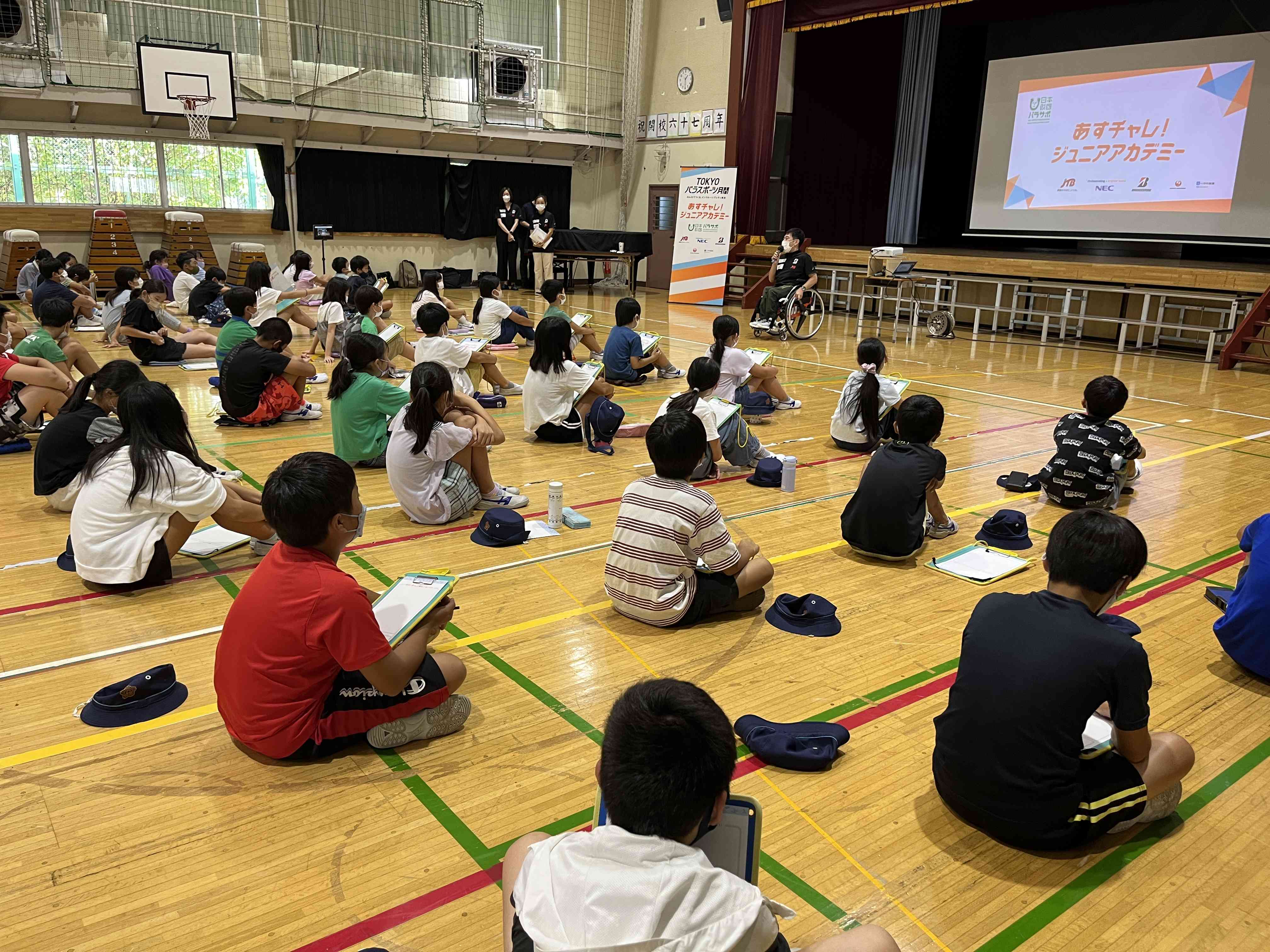 「あすチャレ!ジュニアアカデミー」(日本財団パラスポーツサポートセンター主催) 講師に伊吹先生(ぶっきー)をお招きし、高学年が授業を受けました。 まずはじめに、 「みんなには、夢ってある?」 そう聞かれると、数名の児童が手を挙げて、 「劇団四季に出たい」 「小学校の先生になりたい」 「野球選手になりたい」 と発表してくれました。 授業では、体に障がいをもつ人、パラスポーツのことを、動画やゲーム、話し合いを通して学びます。 特にゲームでは、楽しみながらも、様々な立場の人の気持ちを真剣に考えていました。 ぶっきーのお話の中に、「夢や目標を叶えるためには、今できないことを明日できるように工夫して、努力して、挑戦していくこと。いろいろな障がいを、みんなの工夫でなくしていくことが大切だ」という言葉がありました。 どんな夢や目標でも、それに向かって工夫し、挑戦できる。そして仲間をみんなで応援する。そんな気持ちを大切にし続けられる六砂でありたいですね。 はじめは夢を答えるのに戸惑っている人もいましたが、授業後の感想では、全員があすへのチャレンジ(あすチャレ)を書いていました。 5.6年生のあすチャレには、六砂の希望がたくさんつまっています‼︎【添付ファイル】