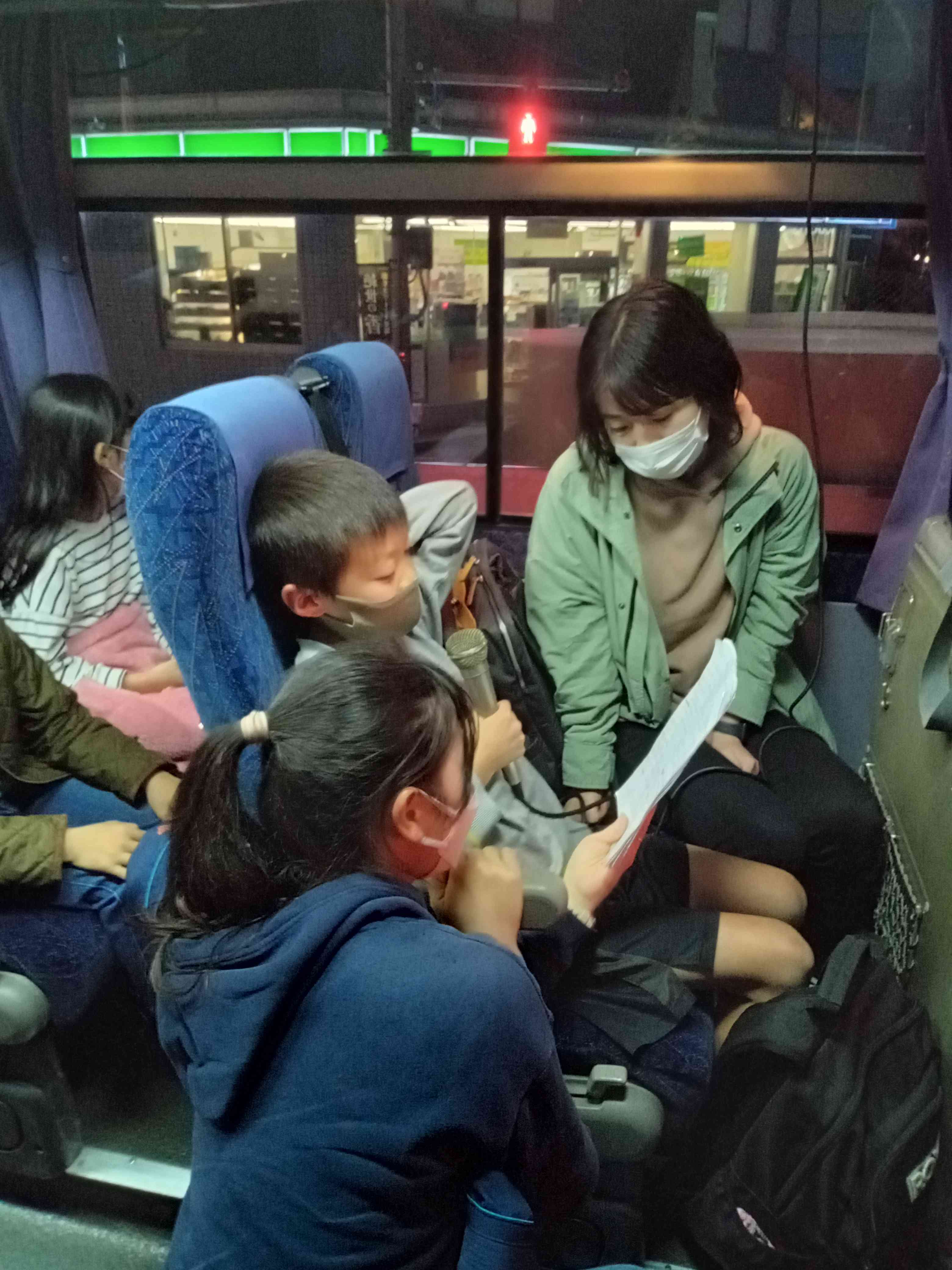 渋滞で帰りが遅くなったため、到着式はバスの中で行いました。バスを降りたら解散です。