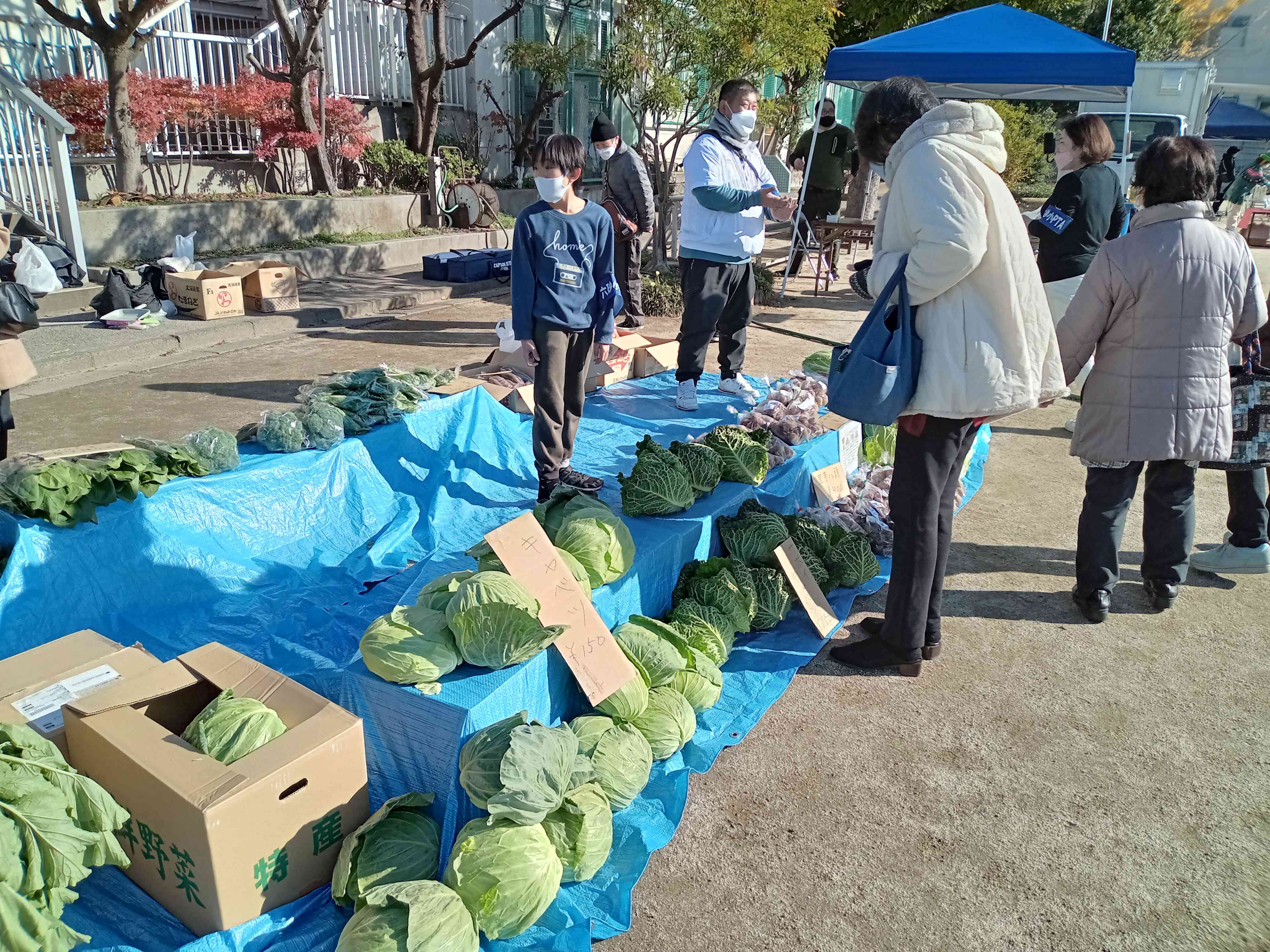 野菜を販売しています。大根100円、キャベツ150円、ネギ100円。他にもいろいろあります。売り切れる前にお買い求めください。