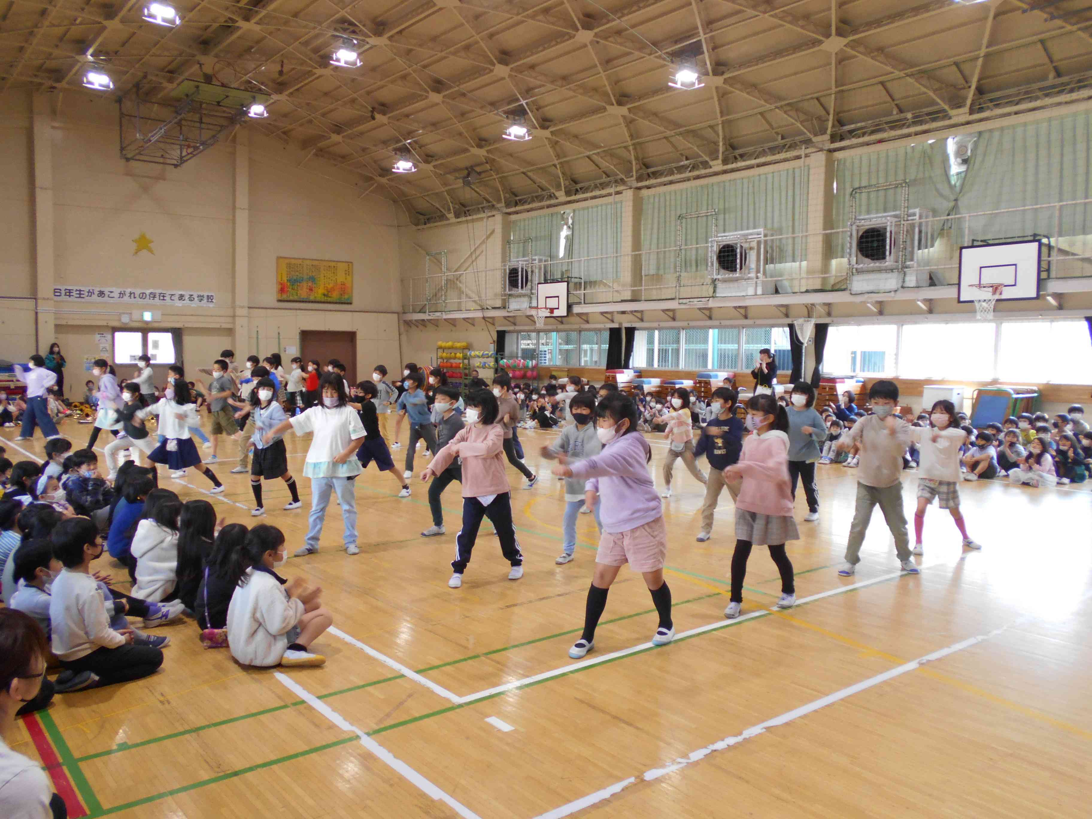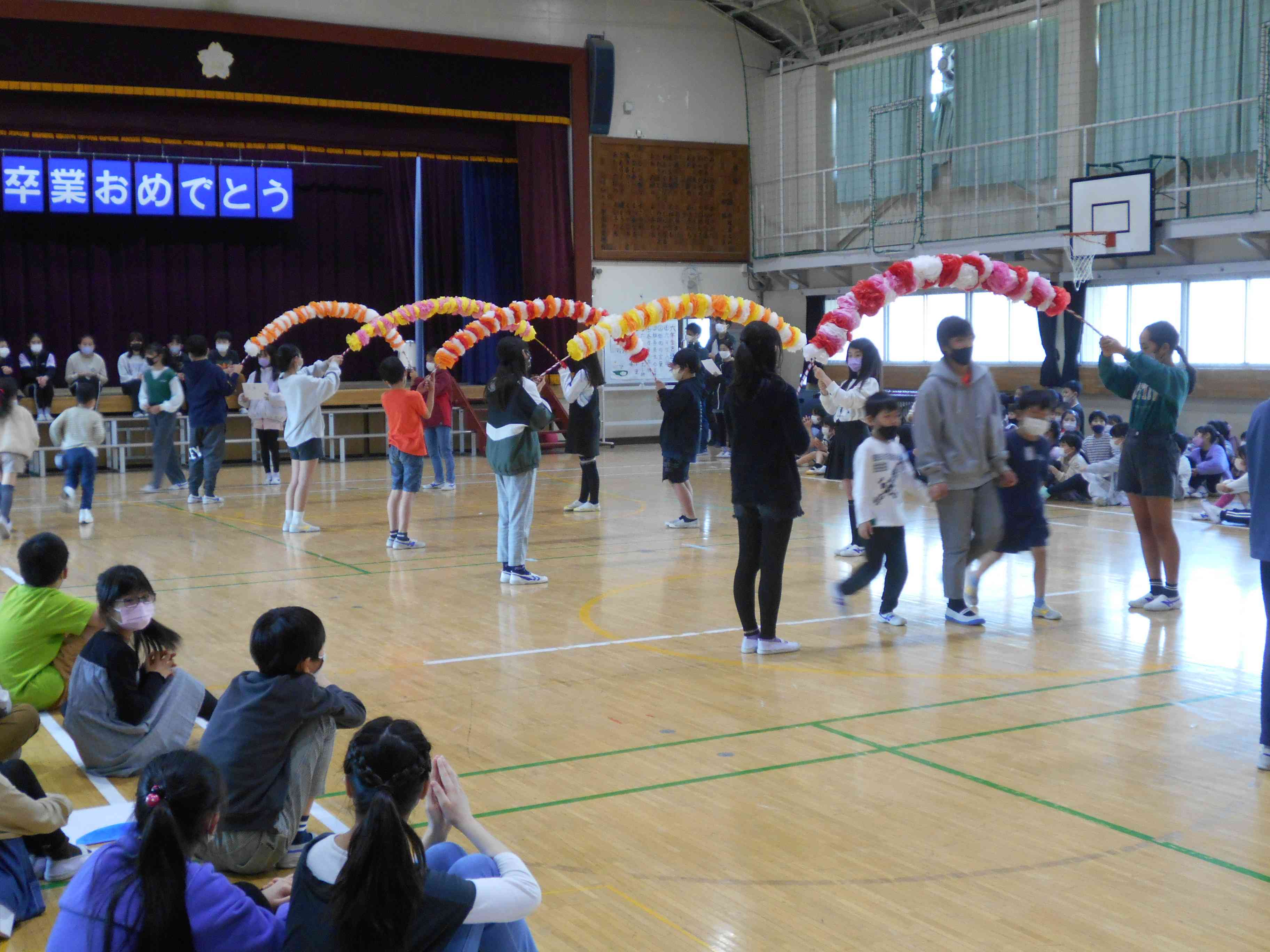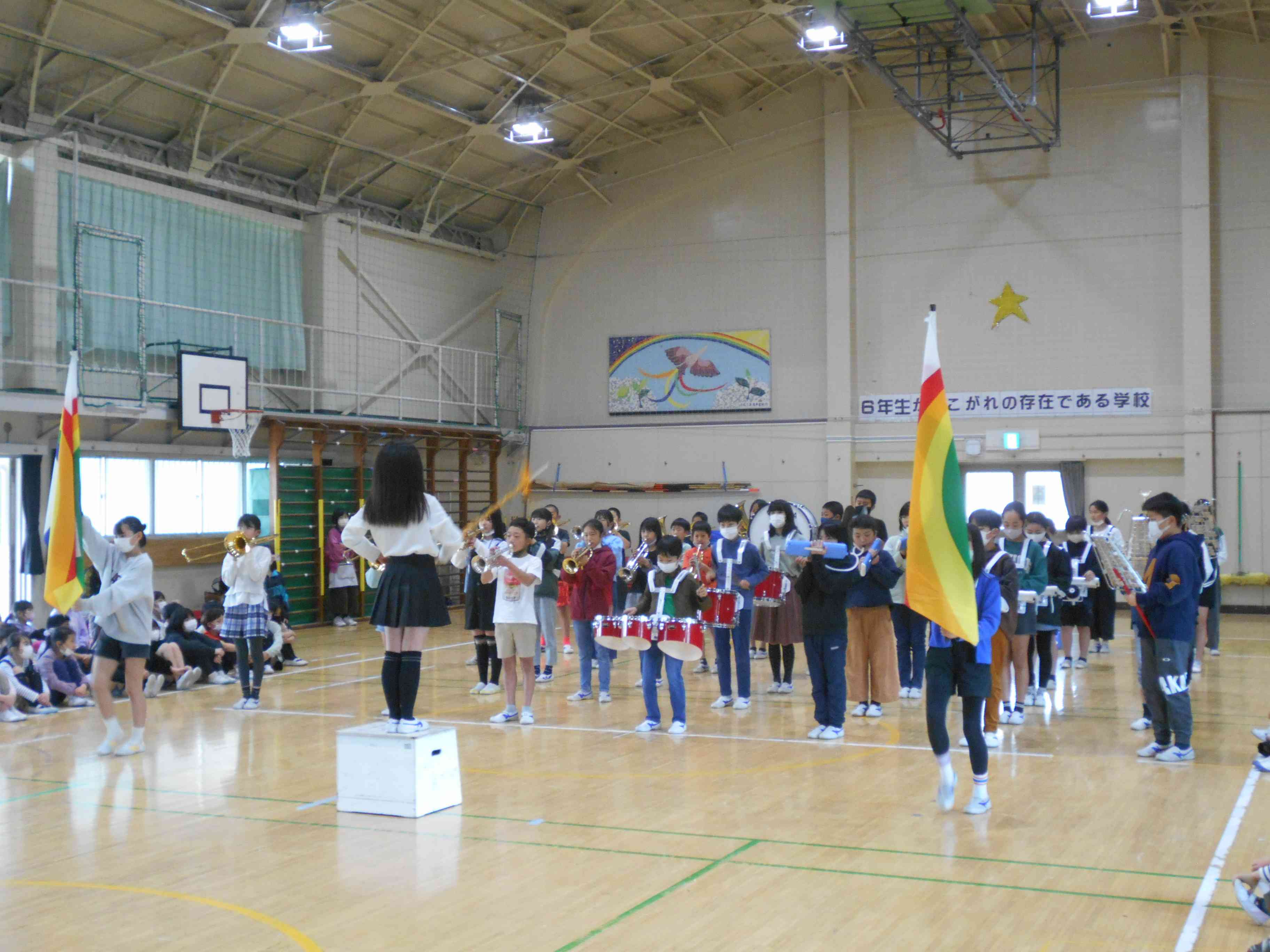 4月の1年生を迎える会のときも、1年生と6年生が手をつないで入場しました。そのときは1年生がとても緊張した表情だったけど、今日は1年生も6年生も、とても楽しそうで、嬉しそうな表情をしています。 今年1年間、6年生の皆さんは六砂ワンダーランドやスポーツフェスティバルなどの行事を中心になって行うとともに、委員会やクラブ活動で六砂小を支えてくれました。とても優しい6年生でした。とてもかっこよくて、頼りになる6年生でした。その6年生と、もうすぐお別れすることになります。今日は、とても短い時間ですが、6年生と一緒に楽しい時間を過ごして、6年生との思い出を作る会に、そして、「6年生ありがとう」の思いを込めた会にしましょう。 各学年からの楽しい出し物を通して、6年生のすごいところや、かっこいいところが改めてよくわかりました。 5年生は、鼓笛と代表委員会を引き継ぎました。鼓笛の練習を始めて1か月ほどですが、6年生も感心する(安心する)演奏でした。 会の最後に、6年生の合奏と合唱がありました。6年生とのお別れを悲しみ、涙を流す子が、どの学年にもいました。本当に全校の児童から愛された6年生であることがよくわかりました。【添付ファイル】