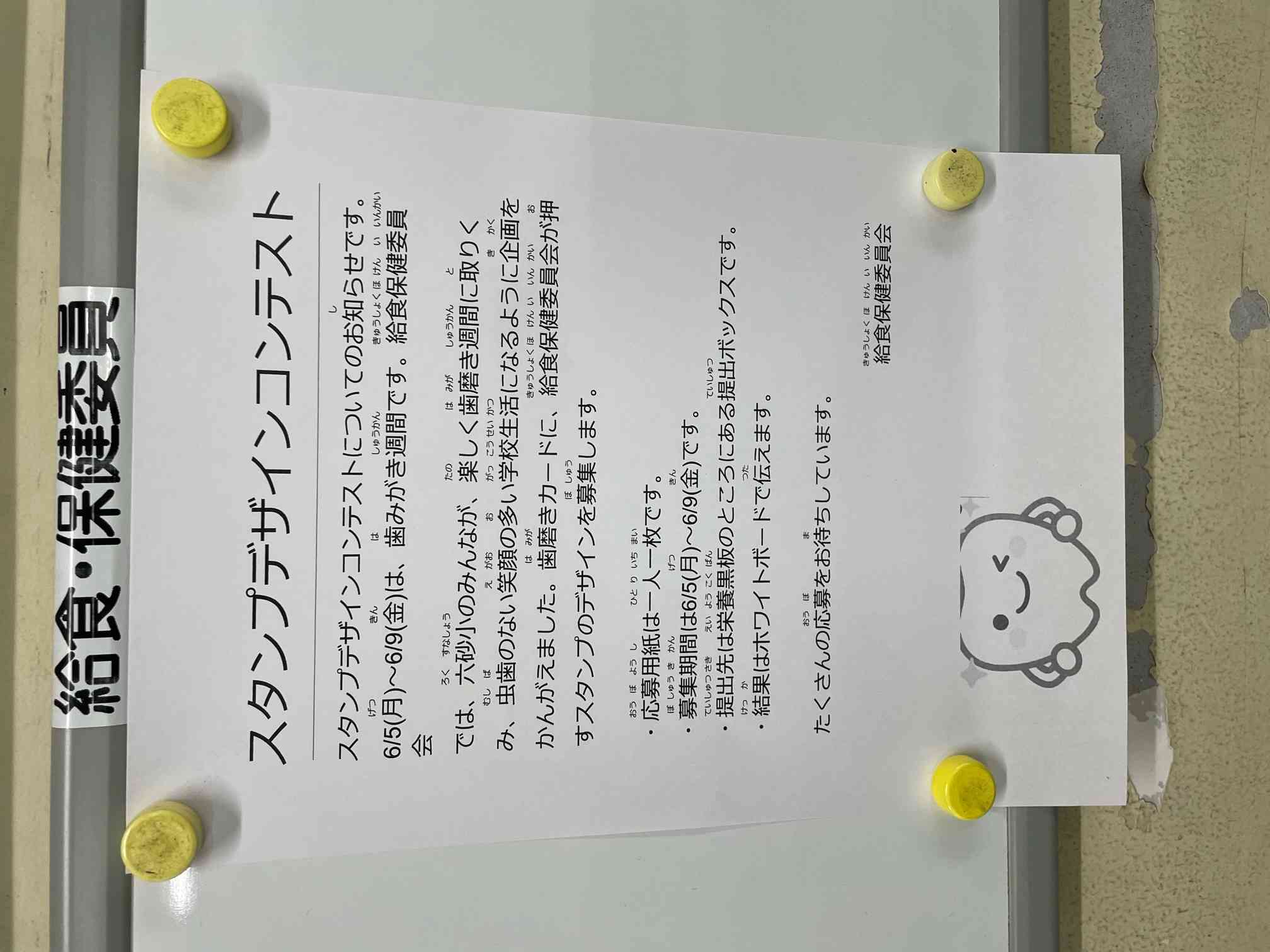 6月4日(日)~6月10日(土)は『歯と口の健康週間』です。 給食保健委員会では、6月5日(月)~6月9日(金)の期間、朝・夜にチェックをつける歯みがきカードを作成し、配布しました。ご家庭でもお子さんの歯みがきを確認し、一緒に取り組んでいただけるとありがたいです。 また歯や口、歯みがきに関するイラストを募集するスタンプデザインコンテストも同時開催しています。 給食保健委員会では六砂小の児童が毎日健康で笑顔の多い学校生活になるよう様々な活動しています。【添付ファイル】