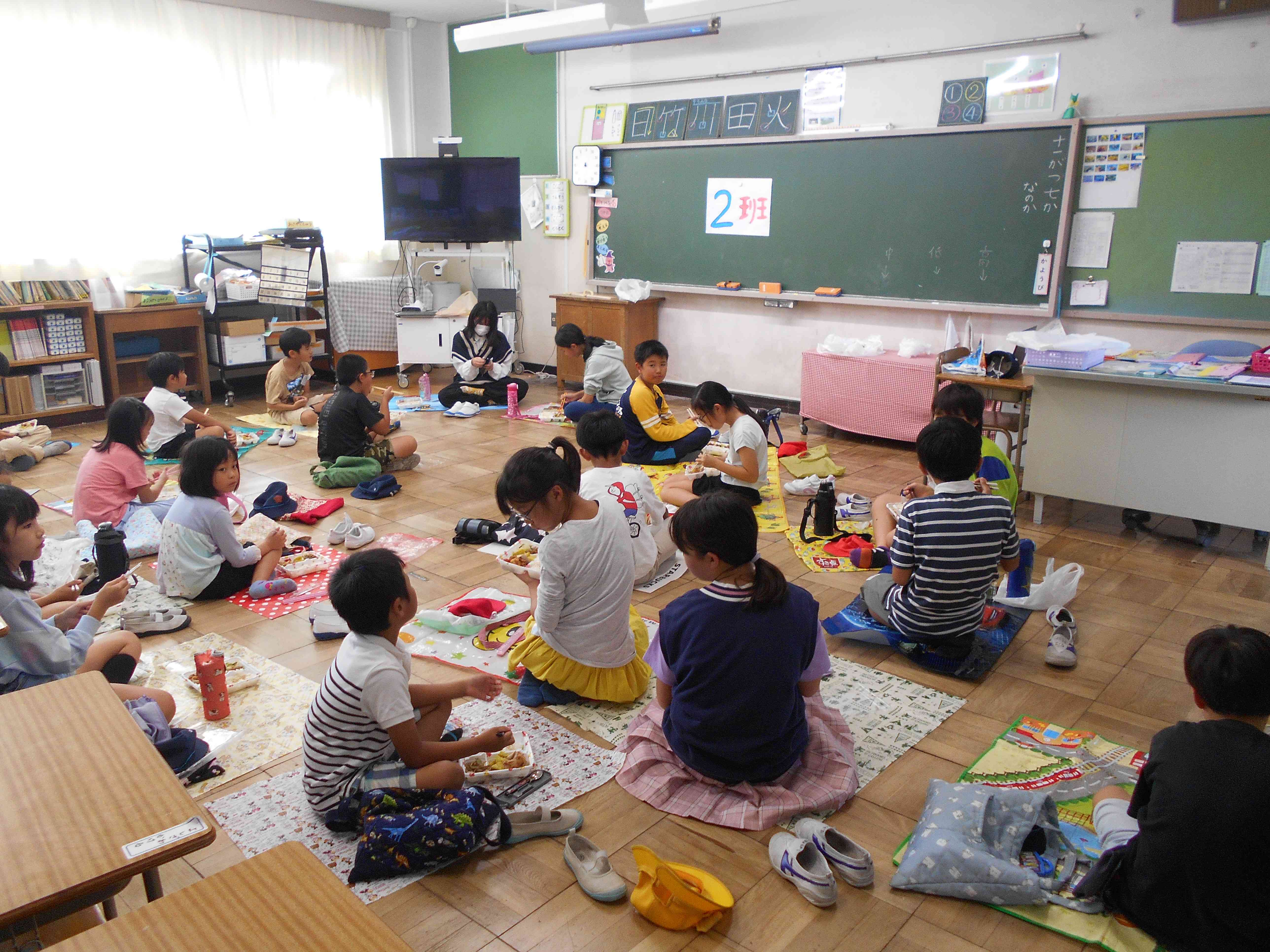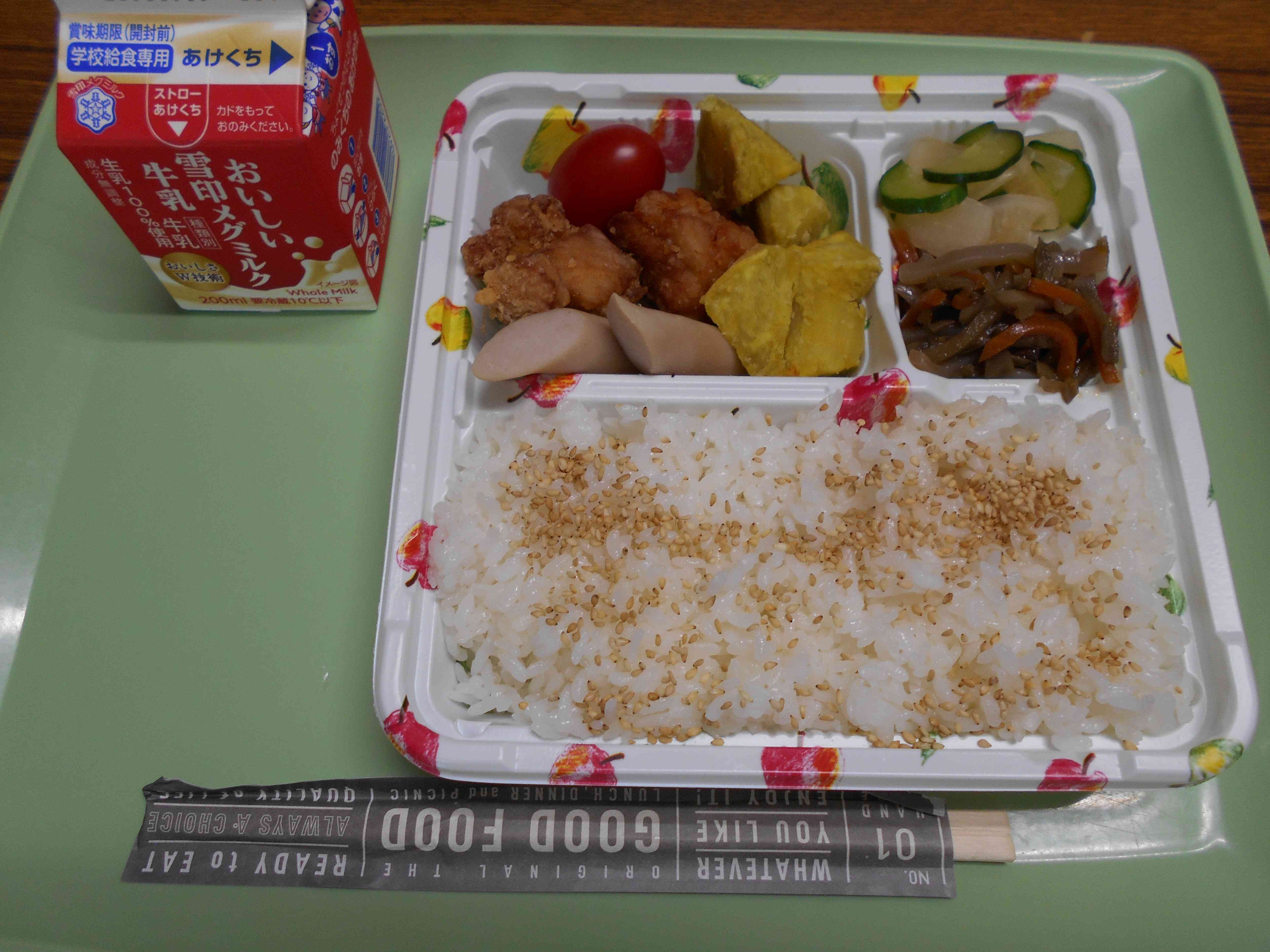 なかよし班遊び・交流給食を行いました。雨が上がって外遊びはできたのですが、風が強いこと、気温が高くなっていたことから、お弁当は教室や教室前の廊下で食べました。 ※弁当の内容は、ごまご飯、から揚げ、ウインナー、きんぴら炒め、さつまいものロースト、大根ときゅうりの浅漬け、ミニトマトでした。とてもおいしかったです。