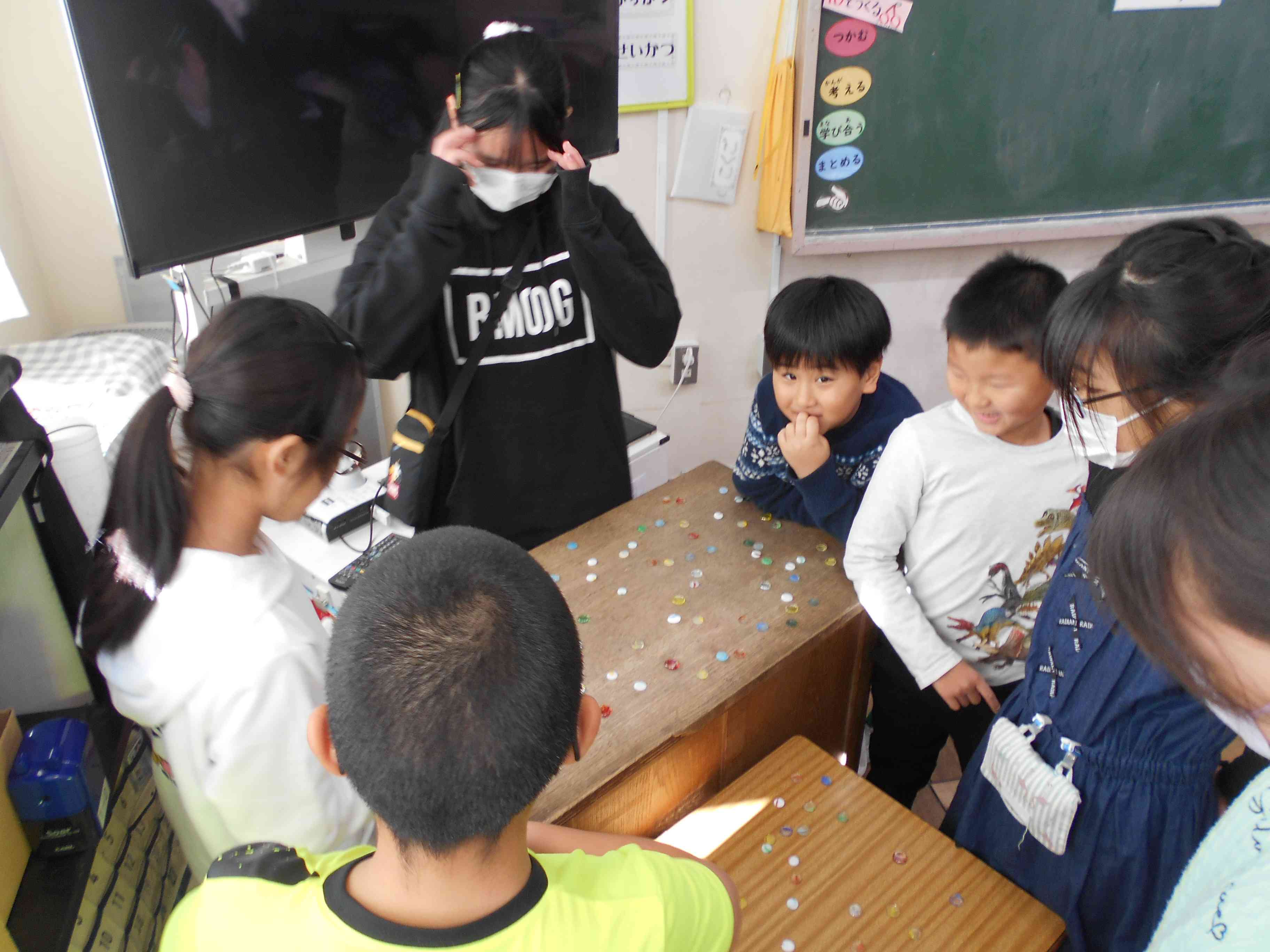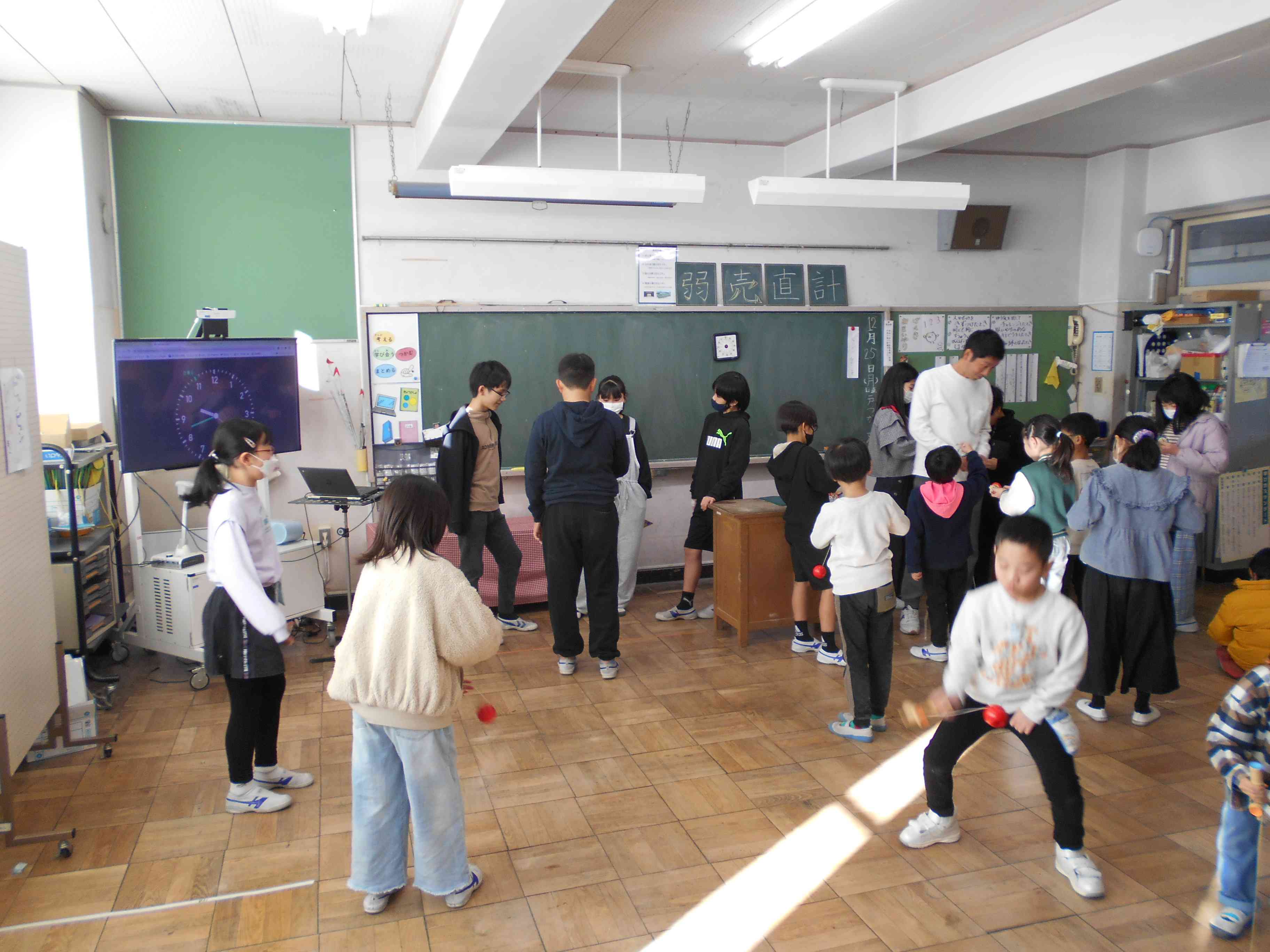 六砂小の冬の名物行事である「子供会遊び(なかよし班遊び)」を行いました。 年末ジャンボ子供会では、すごろくや百人一首、六砂かるたなど、日本の伝承遊びに親しむ機会を大切にしています。 下級生が上級生にこま回しのポイントを教えたり、普段はなかよし班遊びの運営に徹する6年生が夢中で遊んだりと、様々な姿が見られる機会となりました。