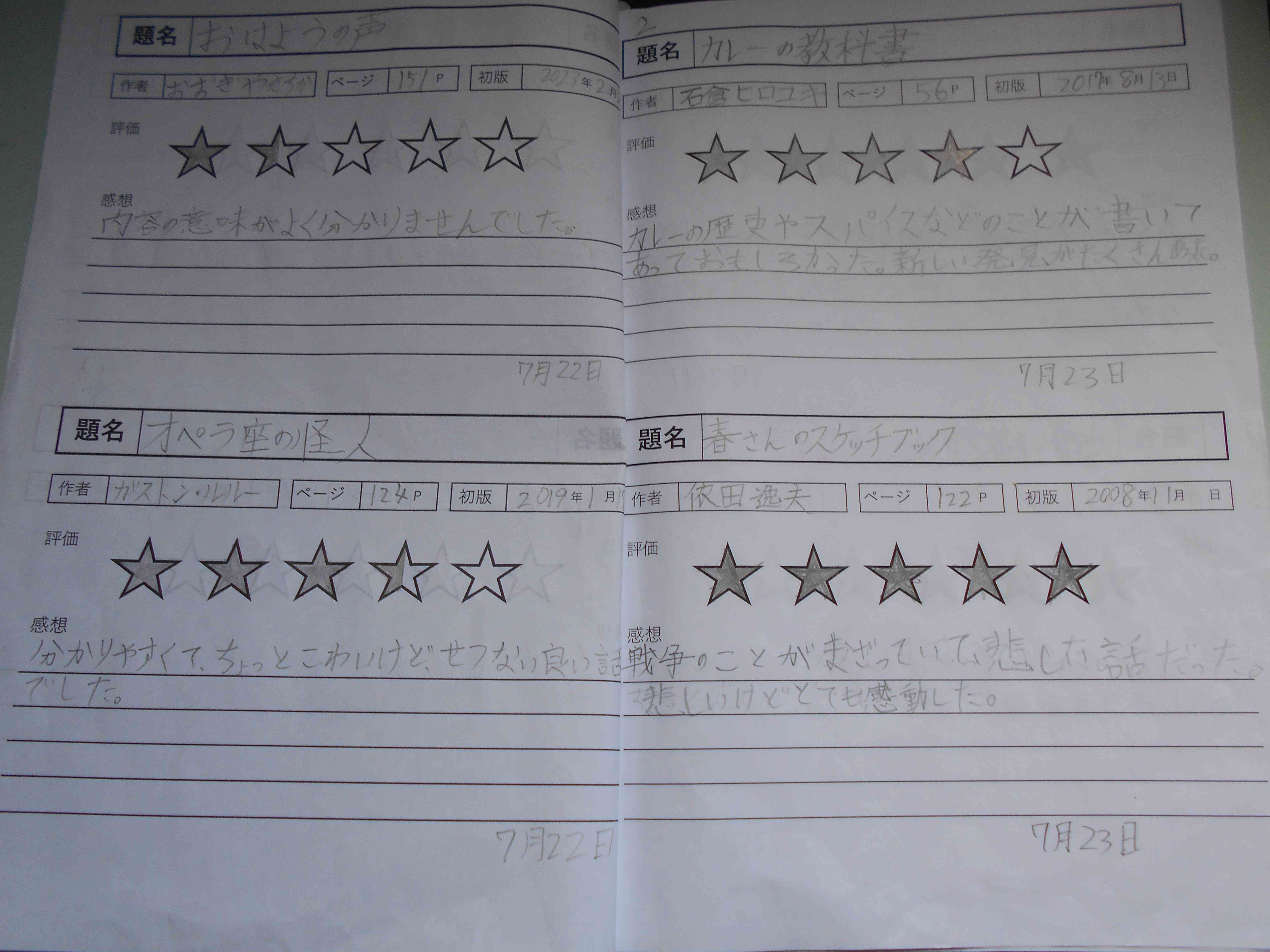 今朝、夏休み作品展を見に行きました。かわいい作品や、面白い研究がたくさんありました。夏休みの思い出を写真と文章でまとめたものは、楽しそうな様子や、その土地の様子がよくわかりました。珊瑚で作ったランプは、部屋を少し暗くして見たら、とてもきれいだろうなと思いました。好きなバレーボールのルールやポジション、日本代表チームのパリ・オリンピックの試合の様子をまとめた作品もありました。自分の名前のネームプレートは、部屋の入り口に飾るとすてきだなと思いました。 たくさんの作品の中で、特に印象に残ったもの2つを紹介します。 一つ目は「ねこの絵」です。かわいいねこの絵に、 「お母さん どうしてねこを かくのかと 聞くけどぼくは ねこが好き」 という歌が書いてありました。ねこが大好きな気持ちが絵と歌から伝わってきました。 二つ目は「夏休み50冊読書記録カード」です。本を50冊読んだこともすごいですが、本の題名や作者名、ページ数などのほかに、5段階で評価して、読んだ感想をまとめていました。ほかの人が本を選ぶときの参考になるし、本の内容を忘れないためにもよいです。これからも続けるとよいと思いました。 今年の作品を見て印象に残ったことは、みんな自分が好きなことや興味があることに取り組んでいることです。どの作品を見ても、「好き」という気持ちが伝わってきました。 最後に、ある人は夏休み前の7月1日から「メダカの観察日記」を書いていて、自由研究は夏休みだけのものじゃないと気付かされました。チャレンジウエンズデーのときに、自由研究に取り組むのもいいですね。 夏休み作品展は、これからもやっていますので、いろいろな作品や研究を、ゆっくりと見てください。 校長 景山賢治【添付ファイル】