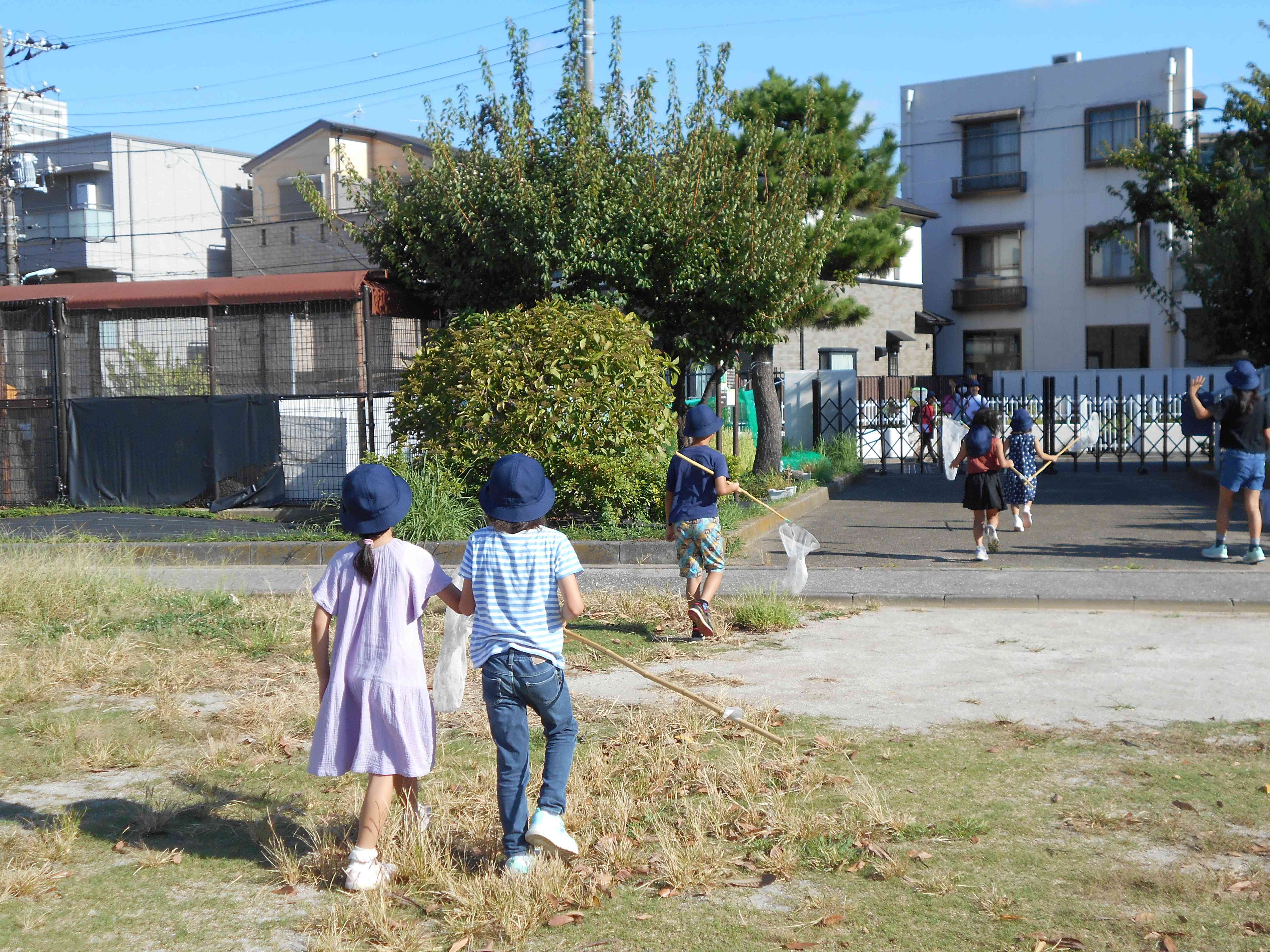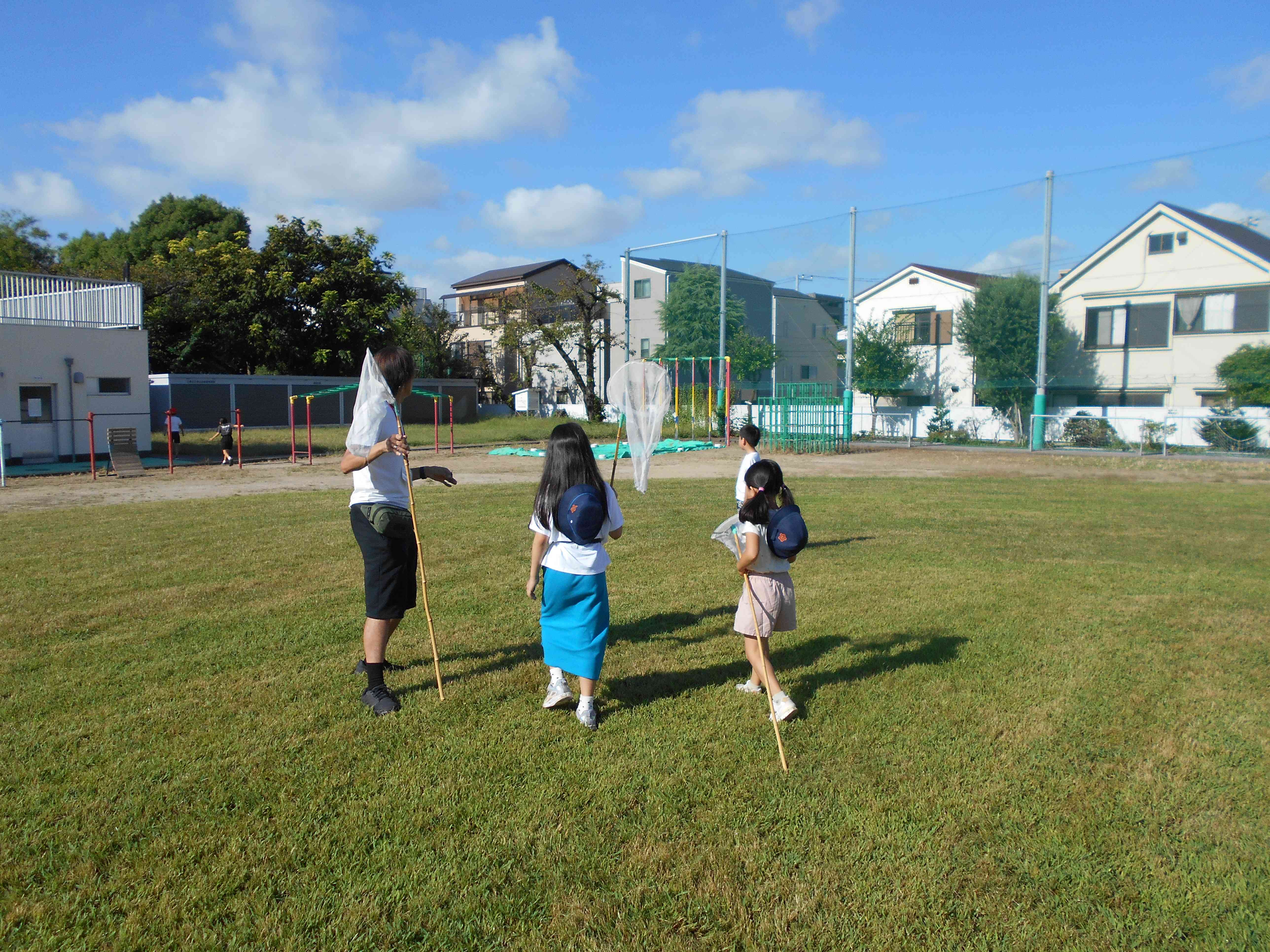 2年生は生活科の学習で「いきものはかせになろう」に取り組んでいます。 涼しい朝のうちに、校庭で虫取りをしています。 チョウやトンボがビオトープの周りに集まるので、意外に捕まります。今朝は赤トンボを獲ることが出来ました。