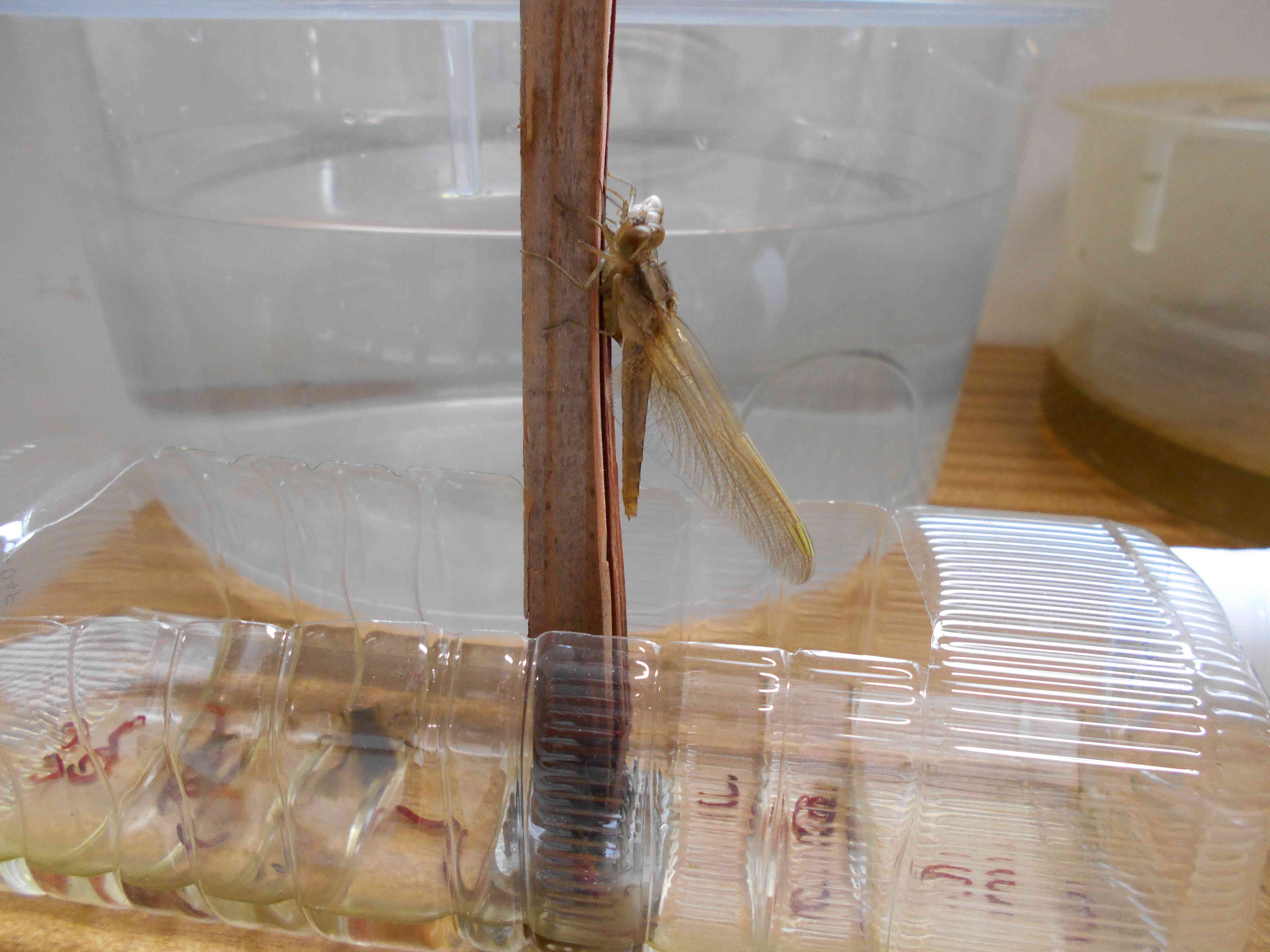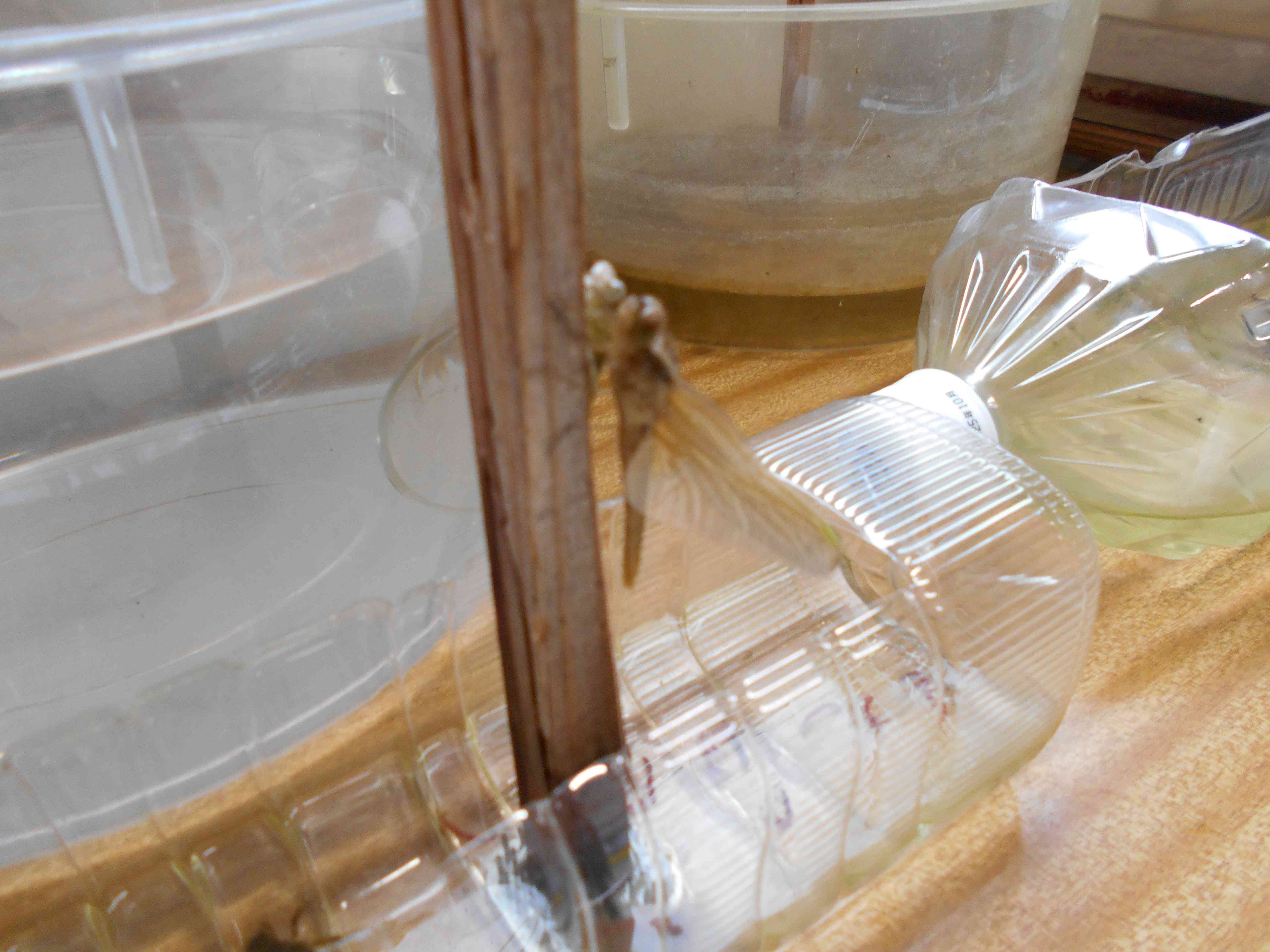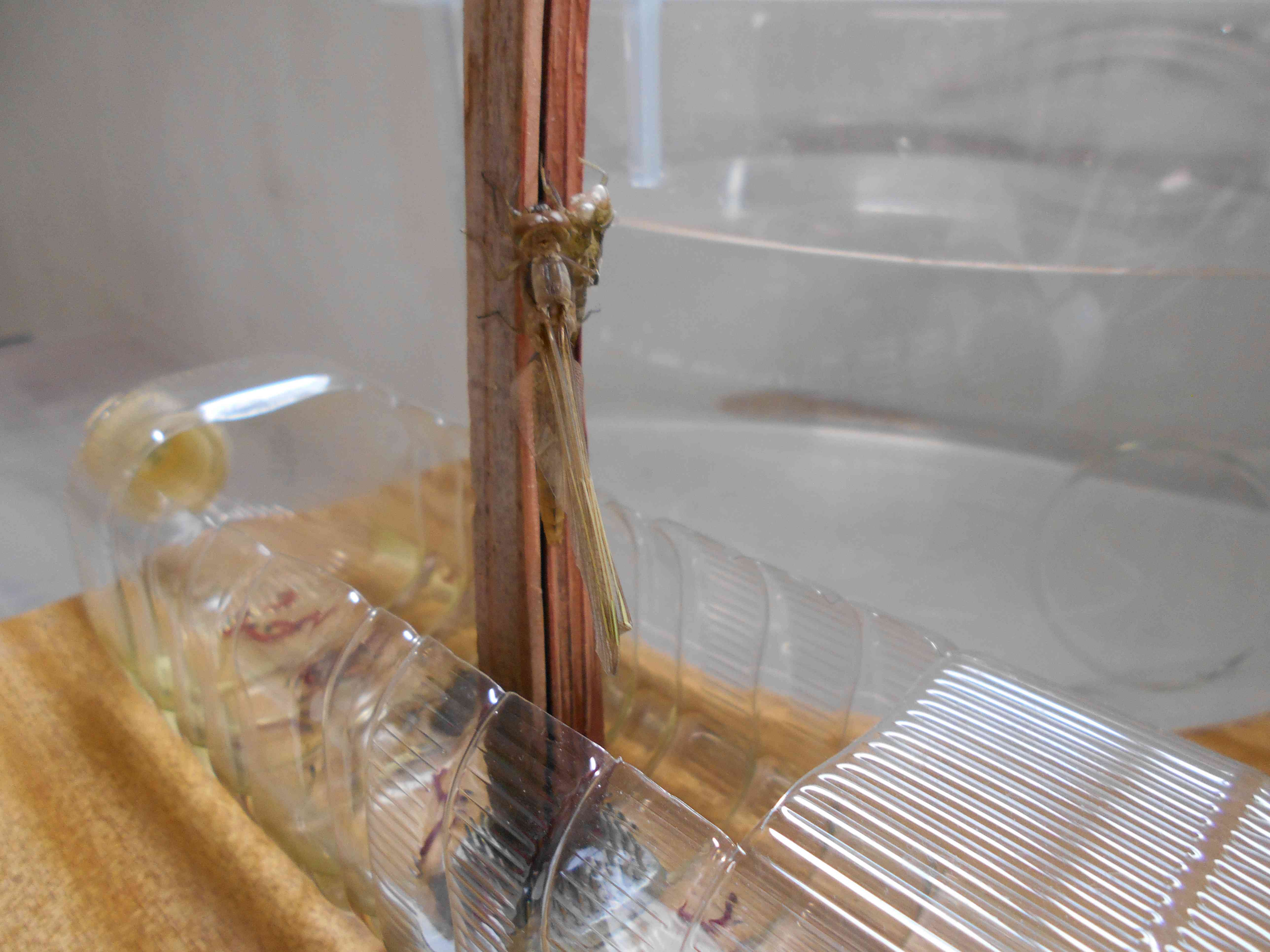 雨模様の朝、職員室前のヤゴが羽化していました。 調べてみるとシンジョウトンボの雌でした。 シンジョウトンボは別名Scarlet Butterflyと呼ばれ、雄の体色が真っ赤になることで有名なトンボです。 なかなか見ることが出来ない貴重なトンボです。 もうすぐ飛び立ちそうです。