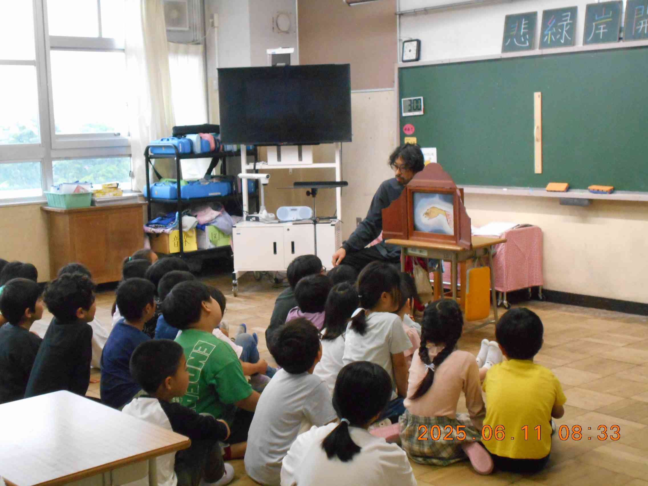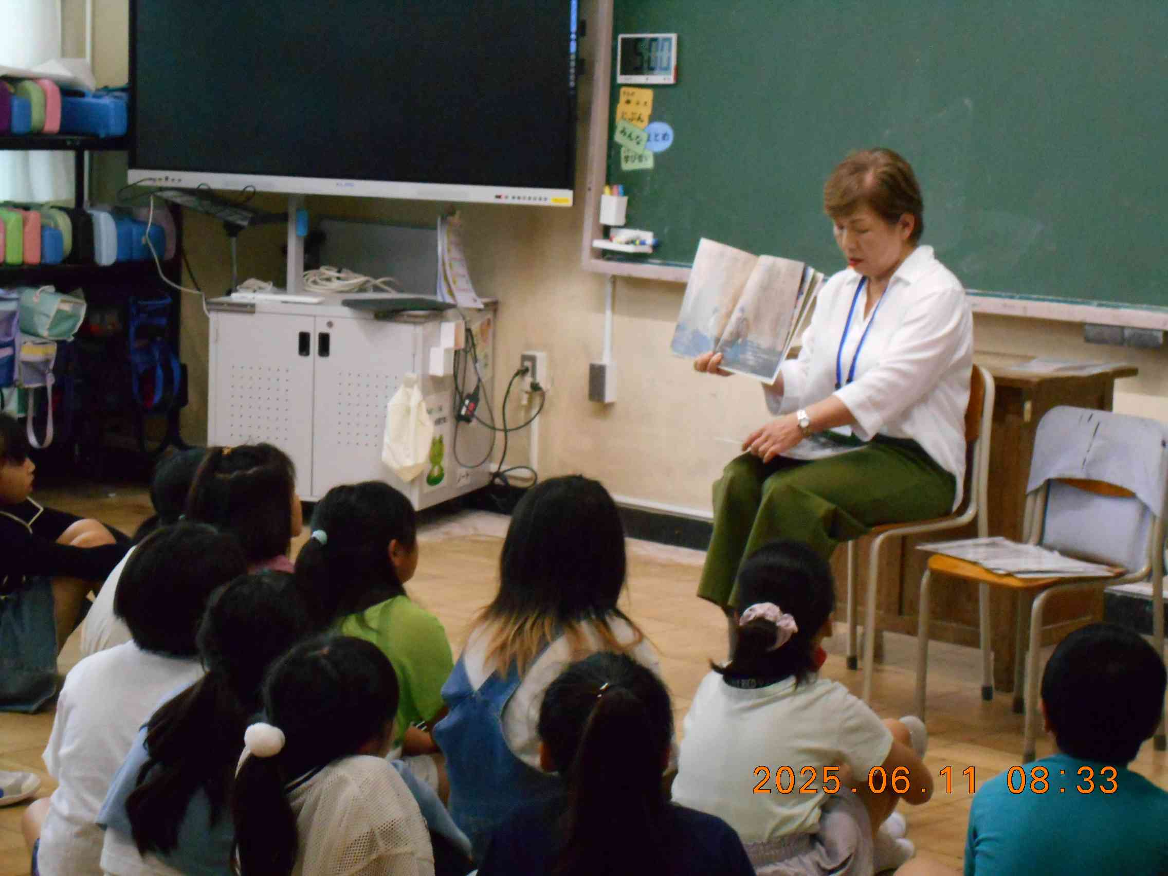 ボランティアの皆さんによる 読み聞かせです。 静かに お話に聞き入る こどもたちです。 (by k)